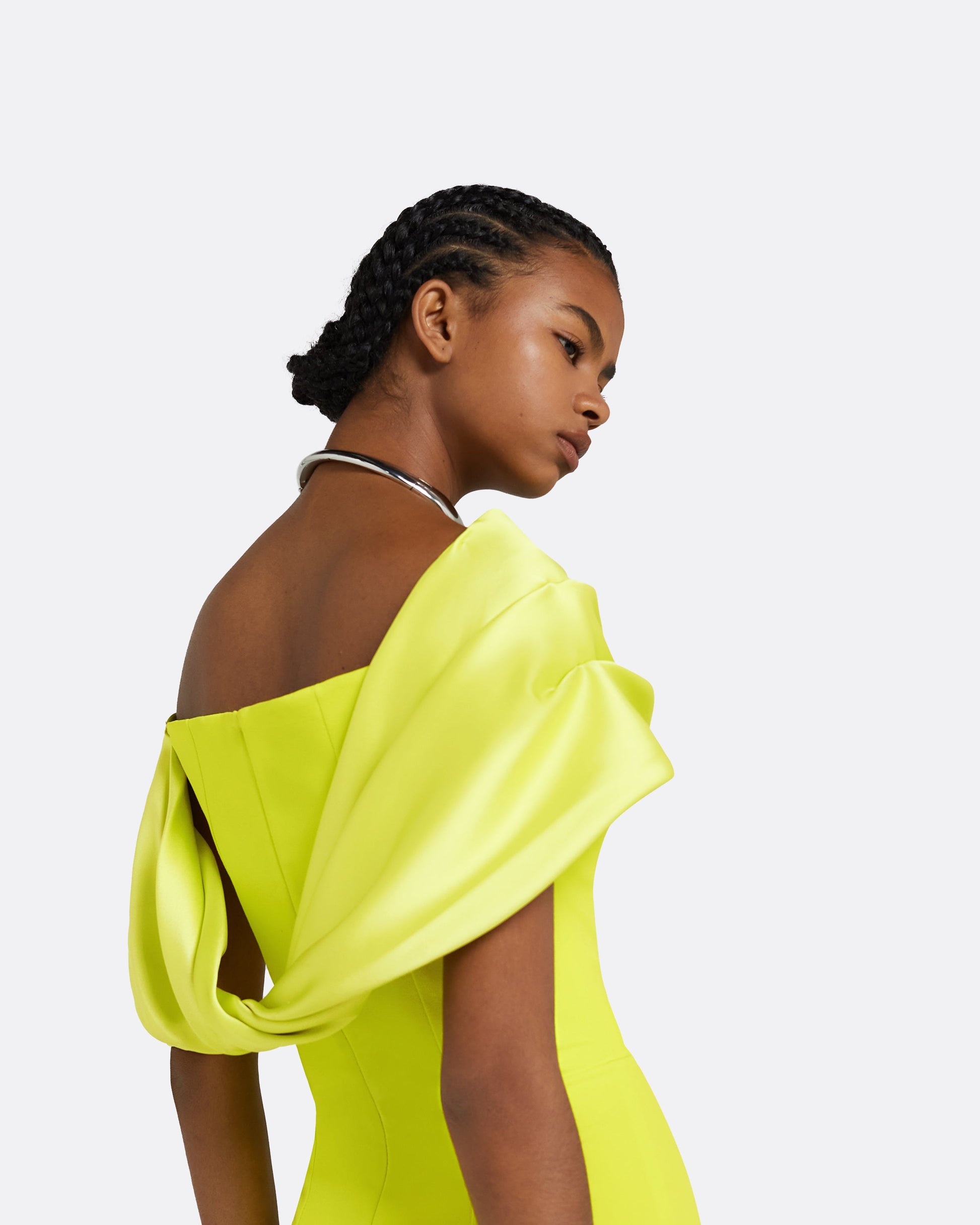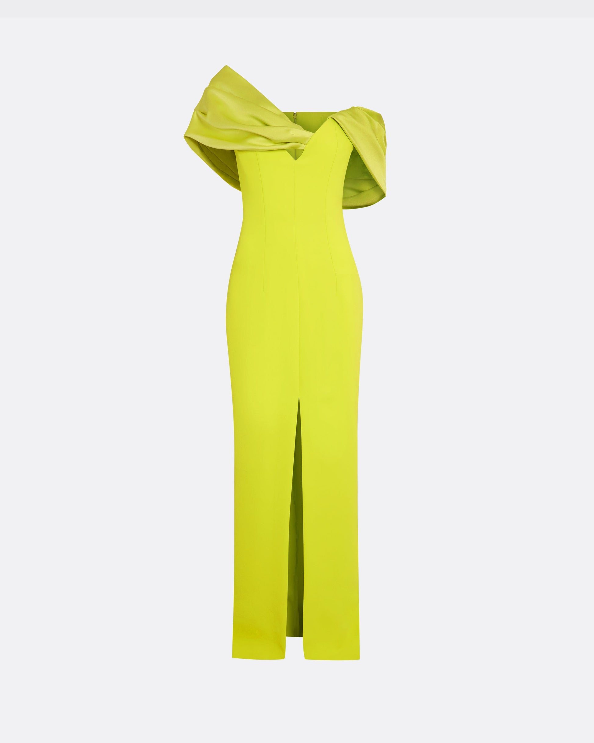 Column gown with flattering construction, front slit and architectural drape in meknes Heavy Crepe and Shine Satin Stretch.
