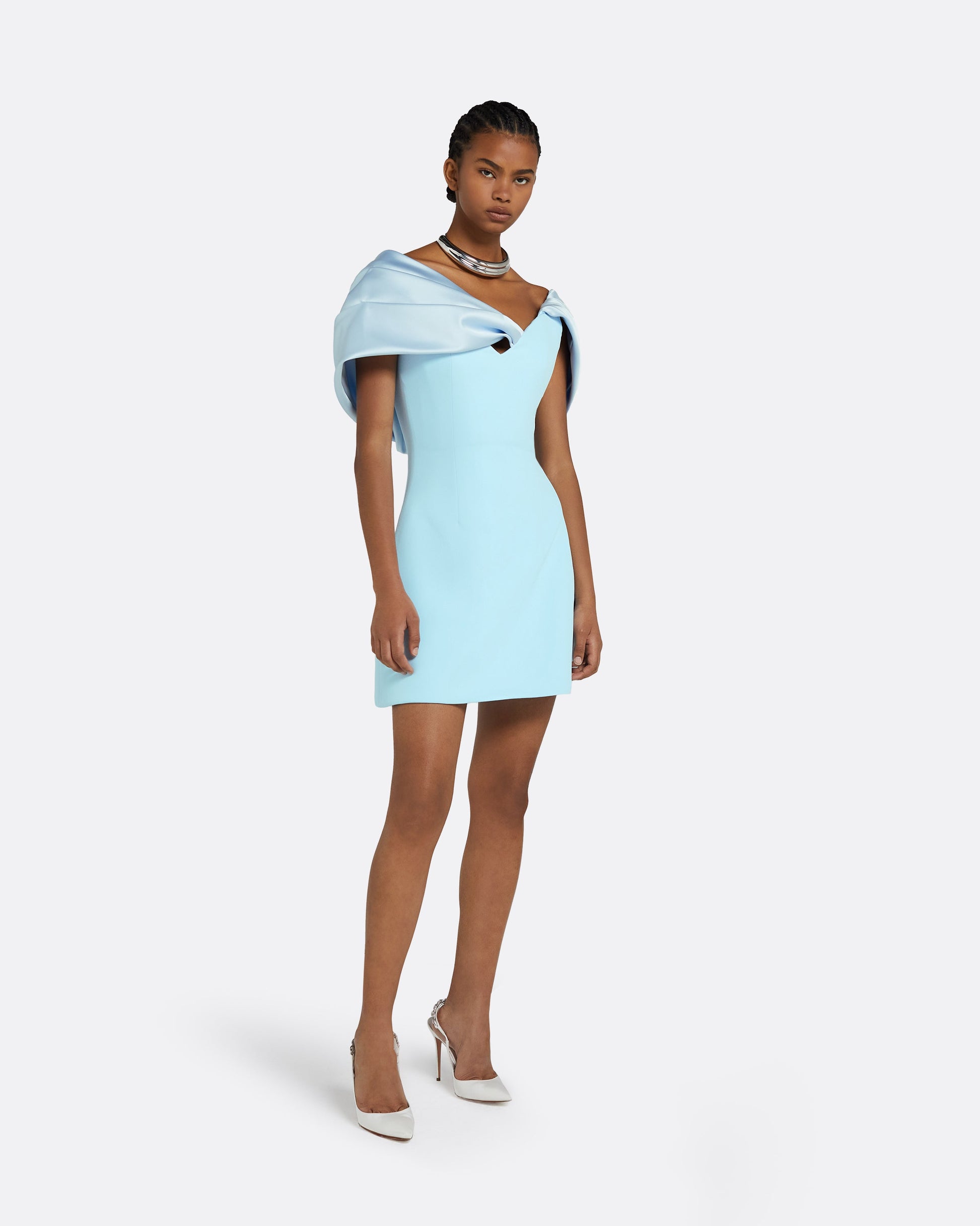 Mini A-Line dress with architectural drape and neckline detail in baby blue Heavy Crepe and Shine Satin Stretch.