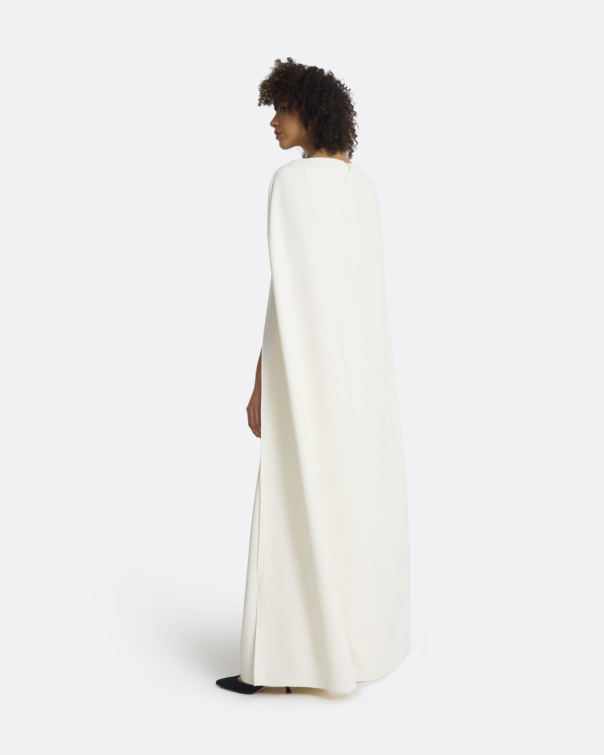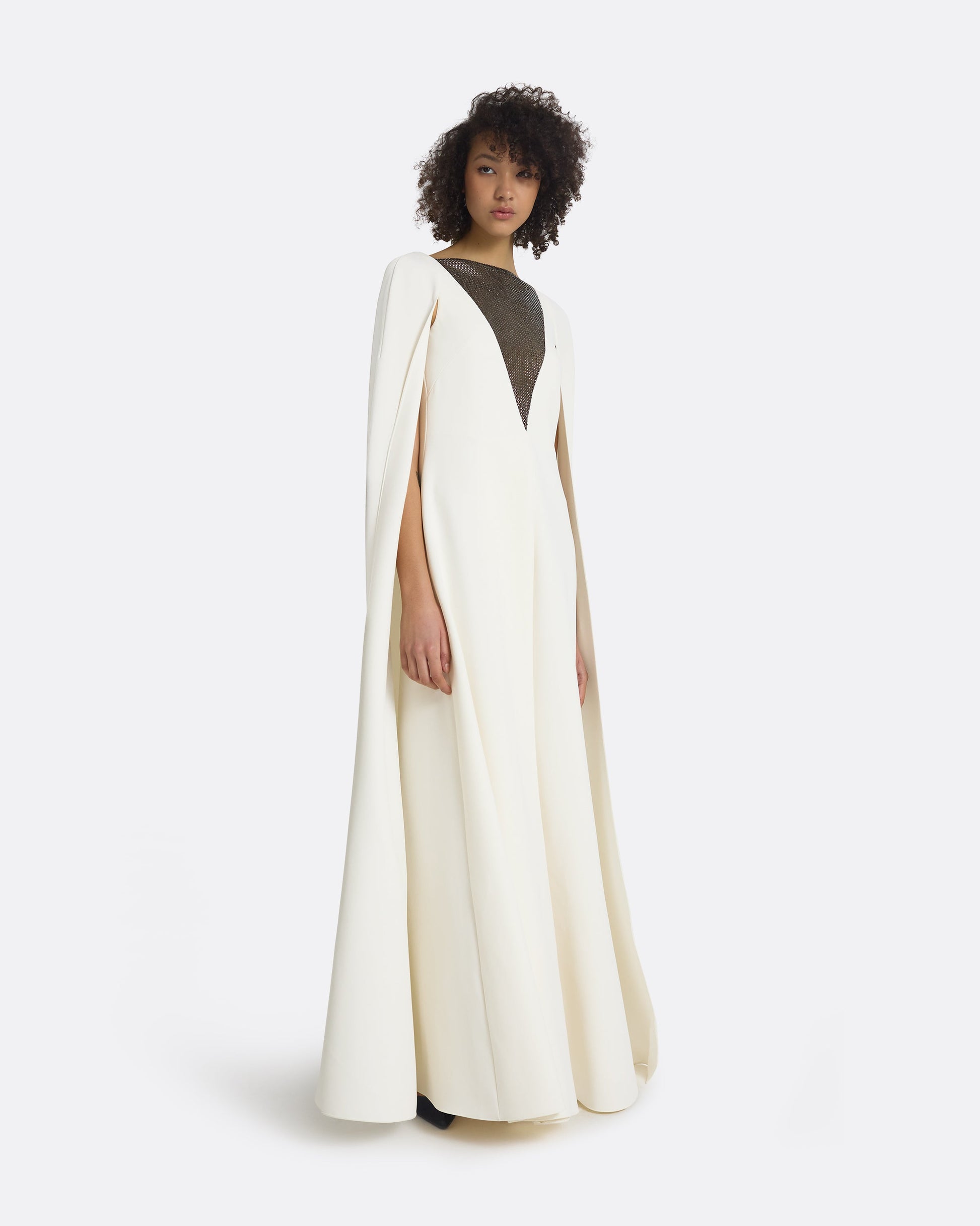 Floor length gown with wide skirt, deep box pleat and caped back in ivory Heavy Crepe with gunmetal Crystal Tulle embroidery.