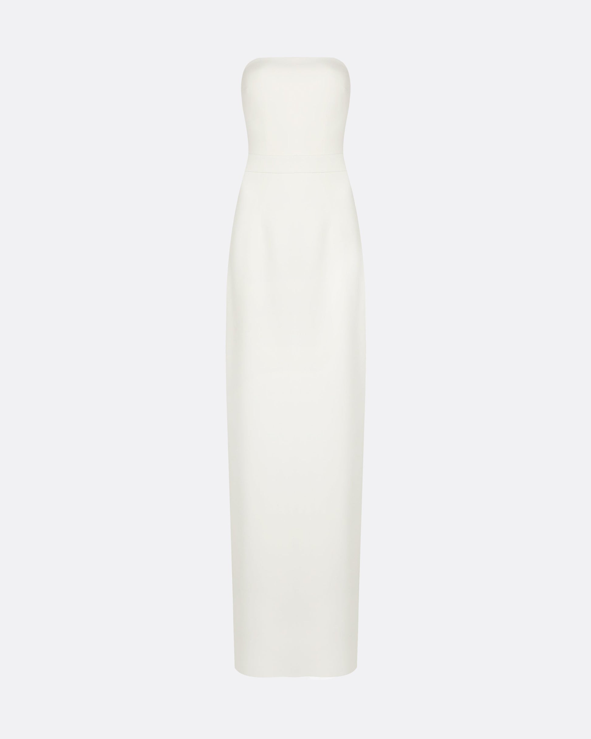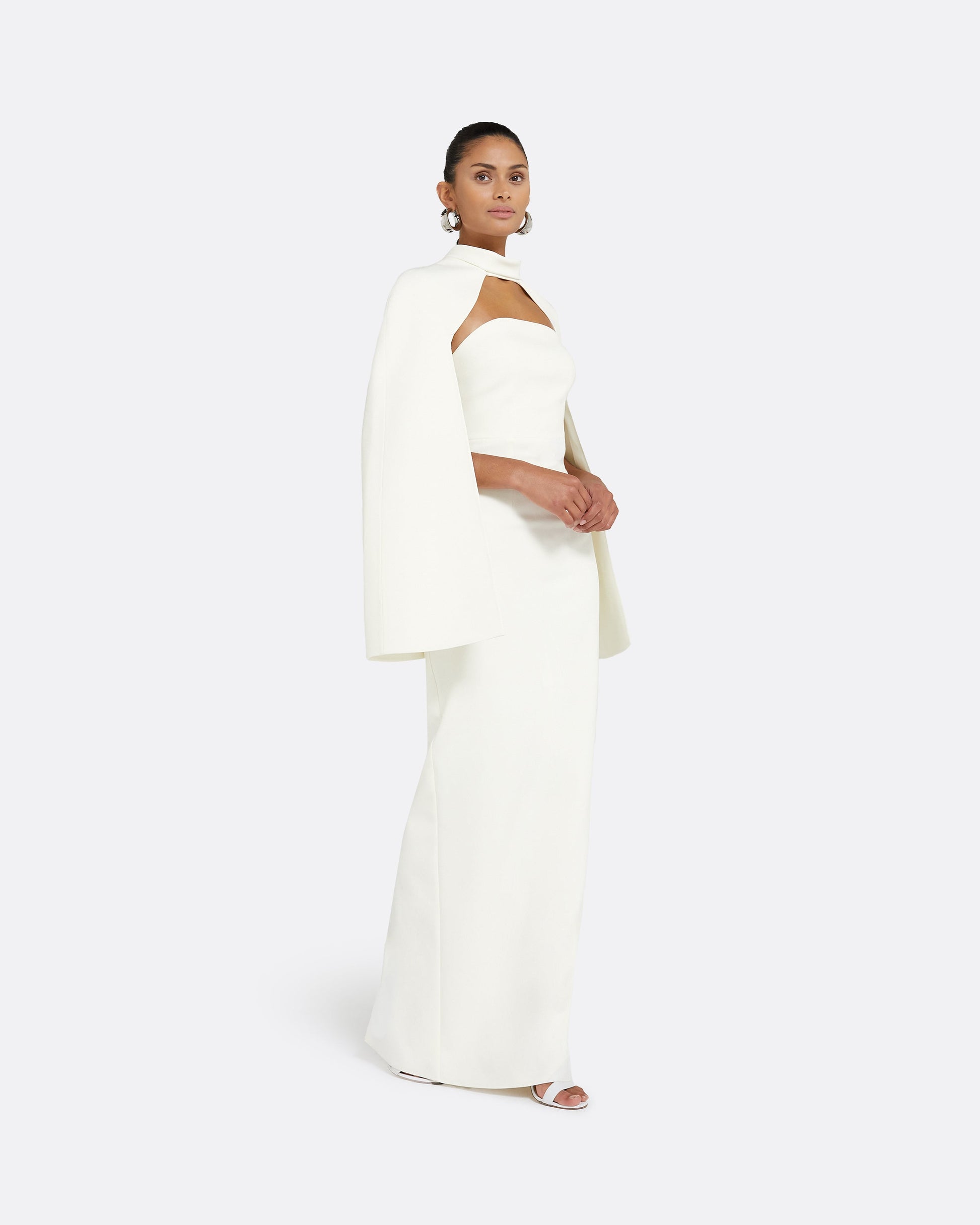 High neck harness with caped sleeve and back bolero in ivory. Sold with a strapless long dress with straight skirt in ivory.