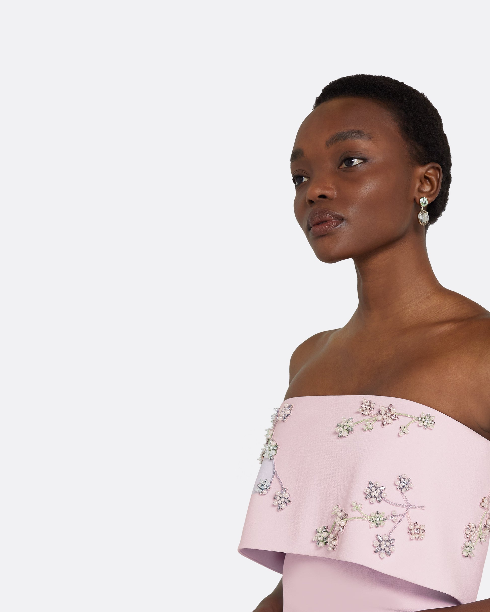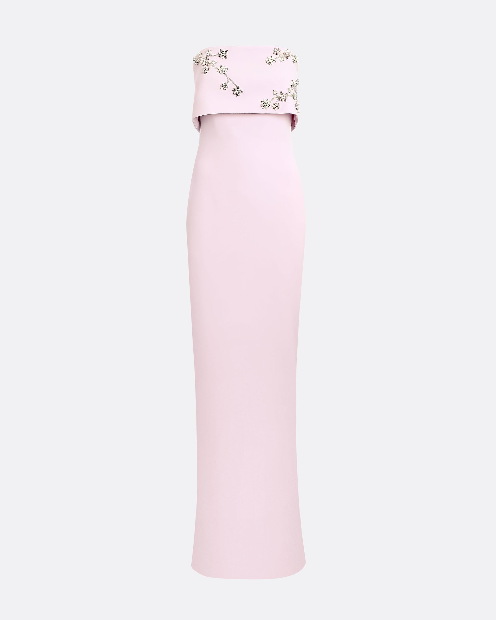 Floor length column gown with layover bustier detail in lilac snow with multi-colour Glass Flower embroidery.