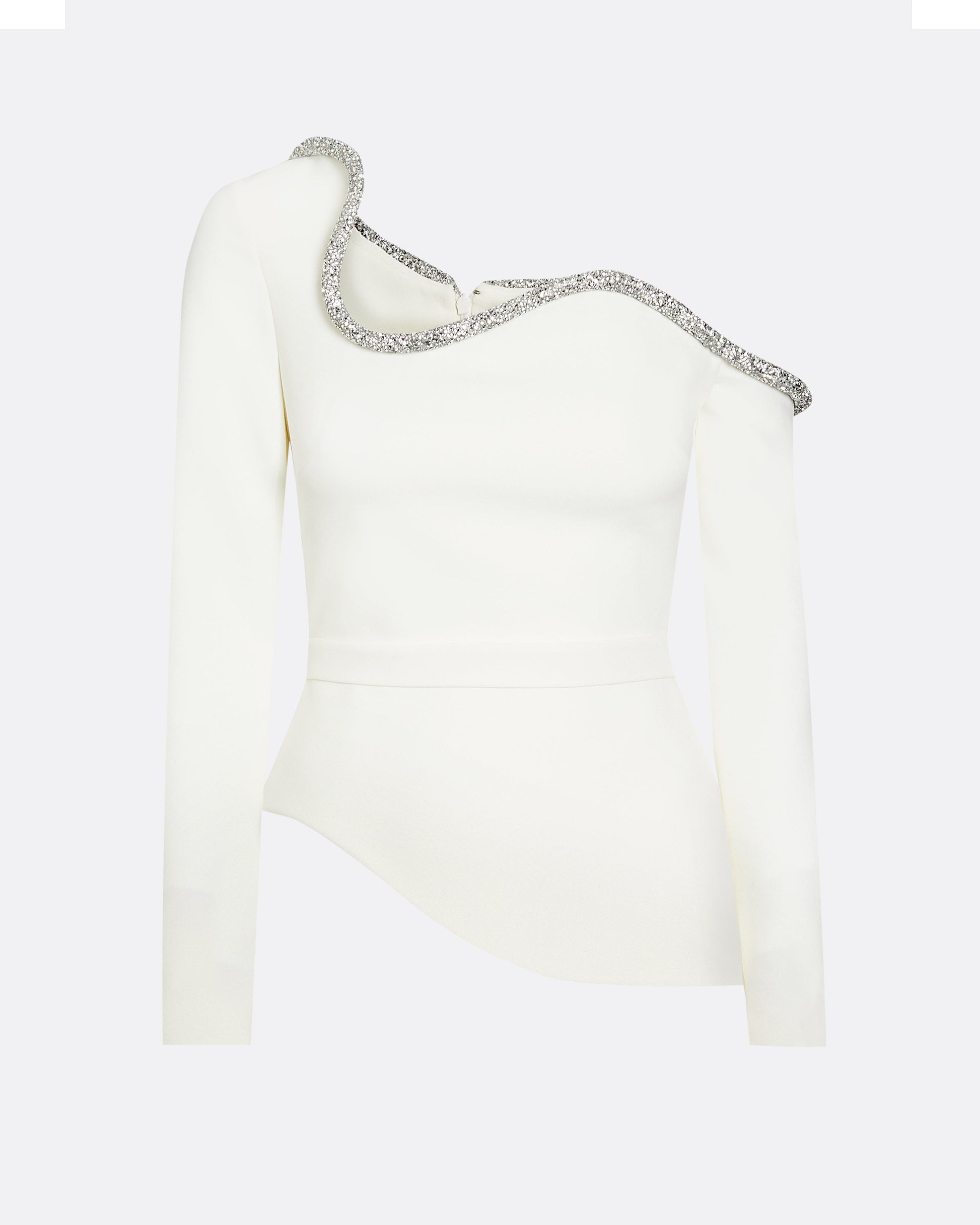 Long sleeved top with asymmetric neckline and peplum in ivory with Crystal Cord embroidery.