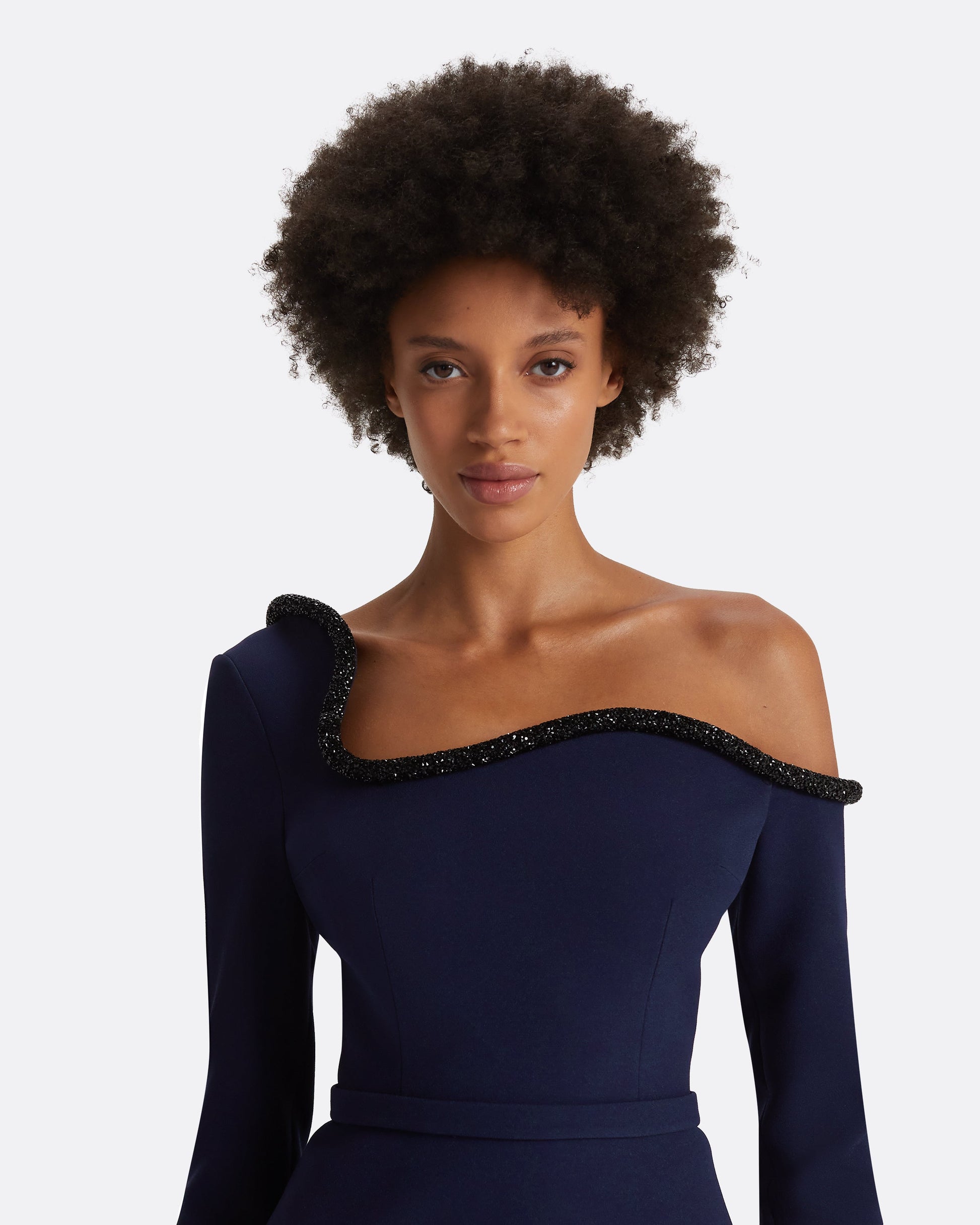 Long sleeved top with asymmetric neckline in azurite Heavy Crepe with black XL Crystal Cord embroidery.