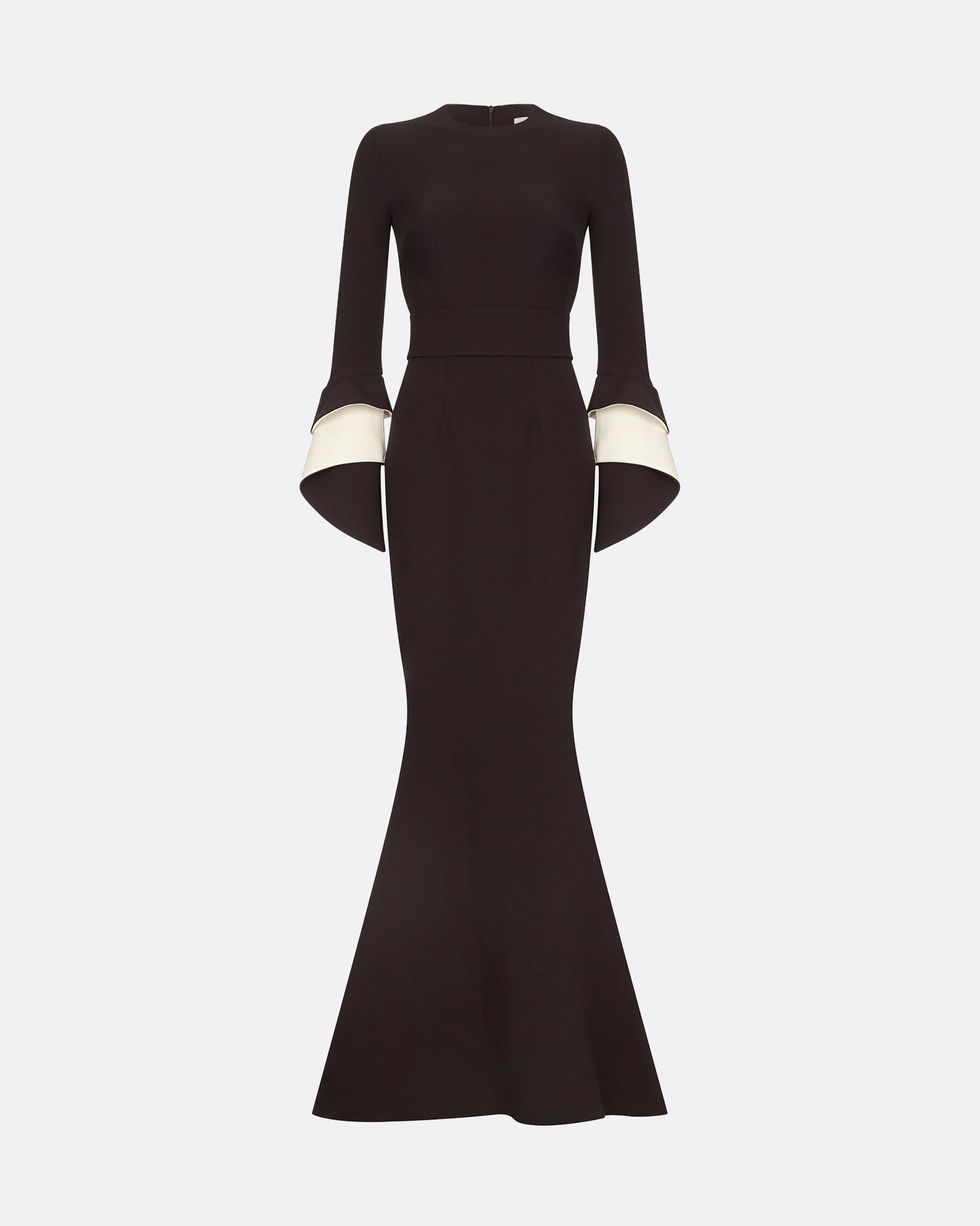 Black and ivory crew neck long dress with lotus drape sleeves.
