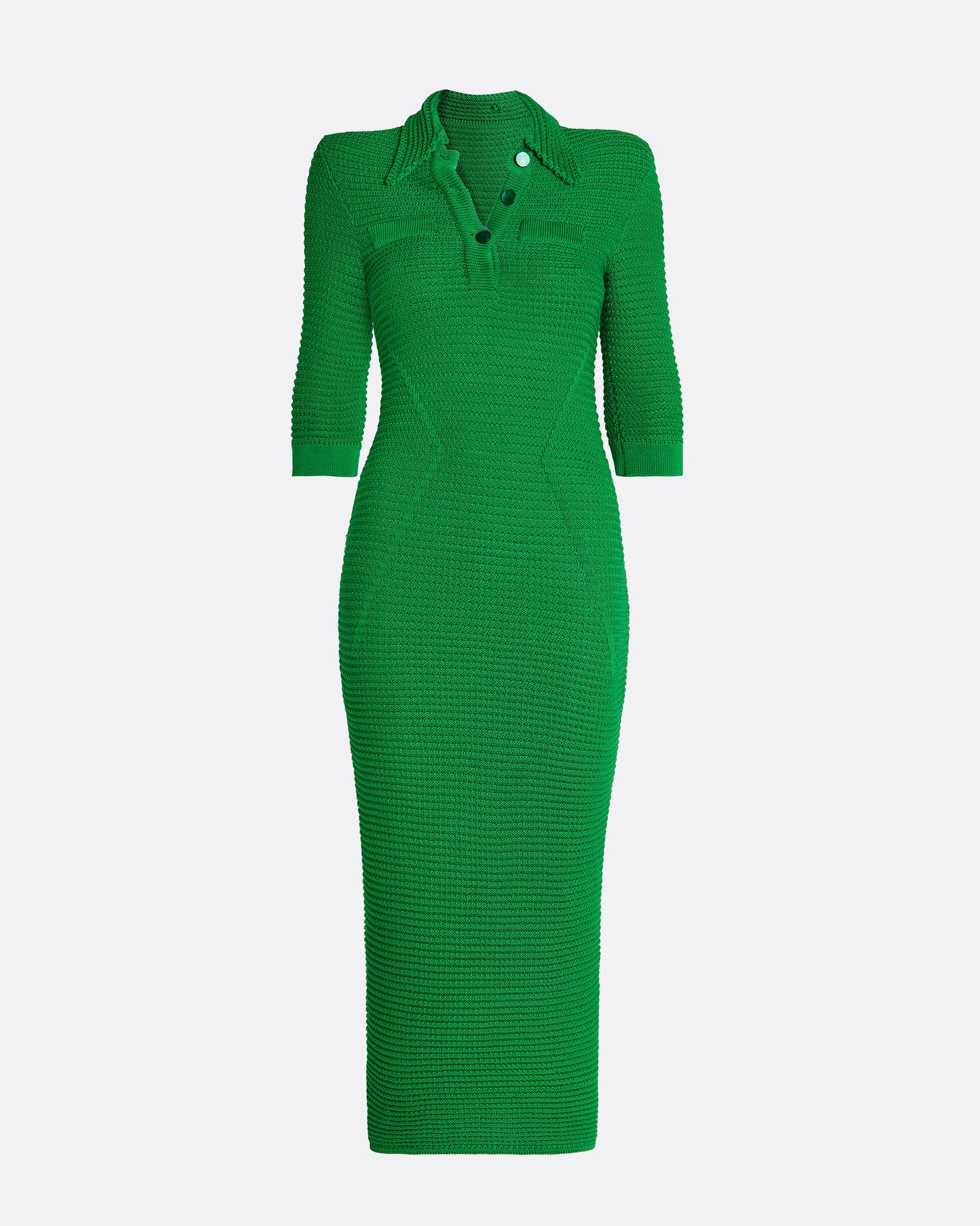 Short sleeve buttoned dress with pocket detailing and collar in emerald Crochet.