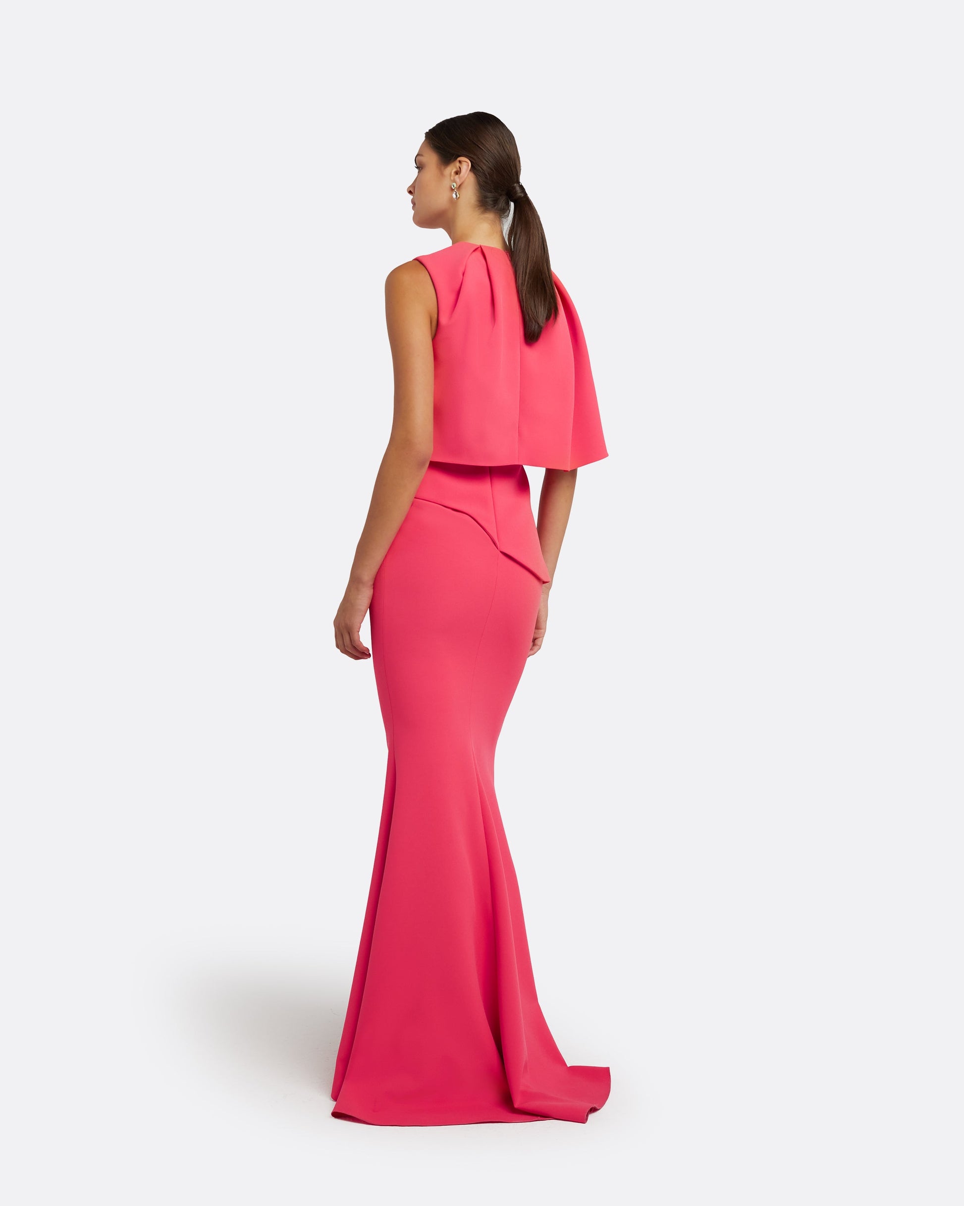 Semi-Caped gown with pleated neckline and curved peplum in grenada Heavy Crepe.