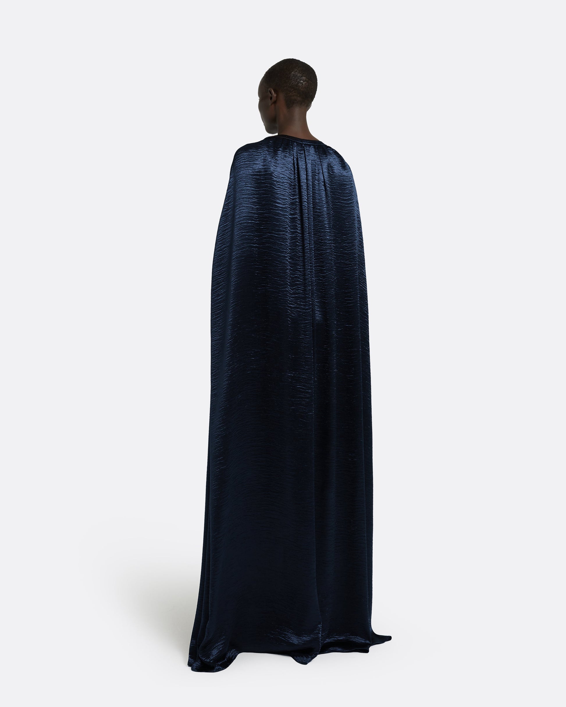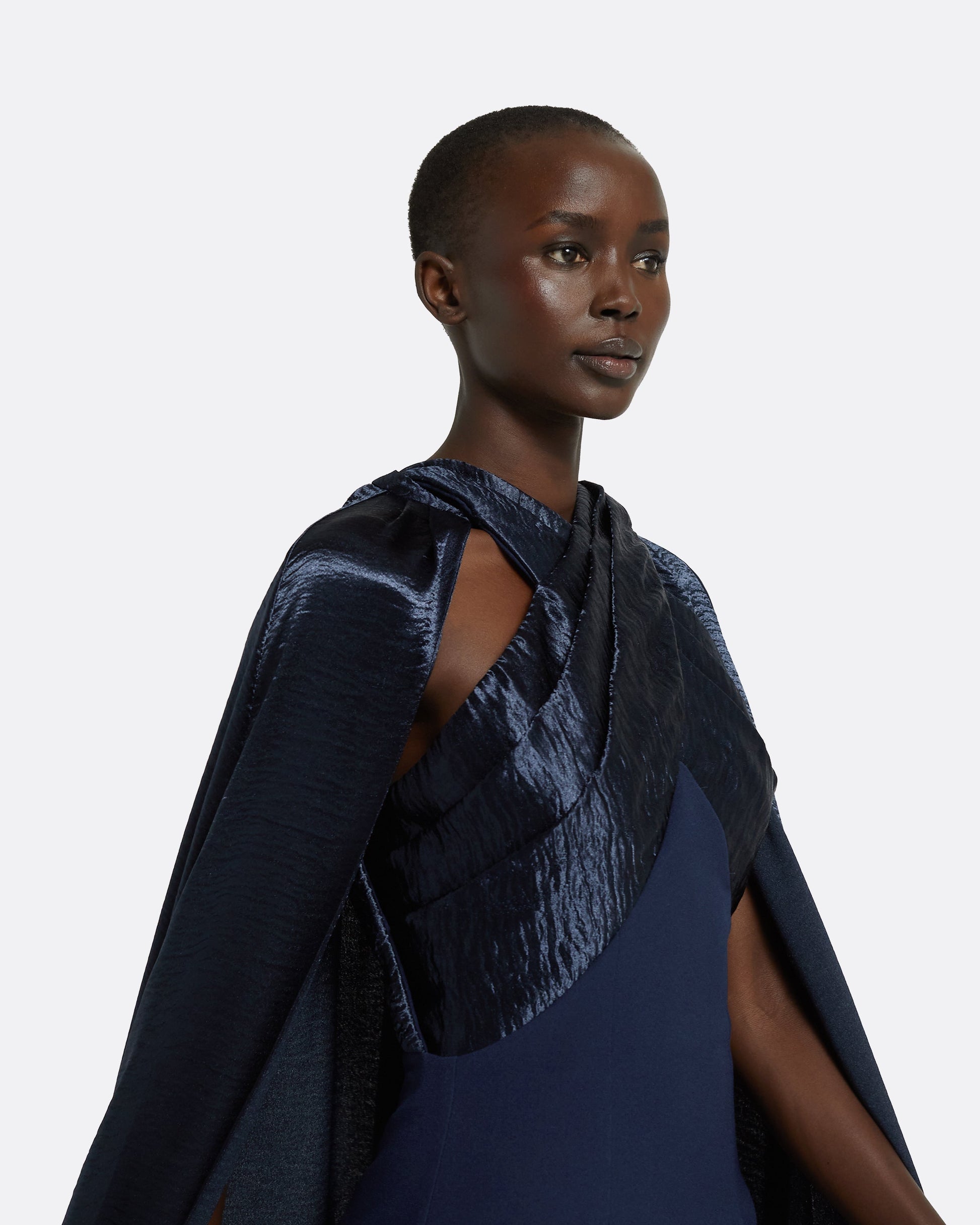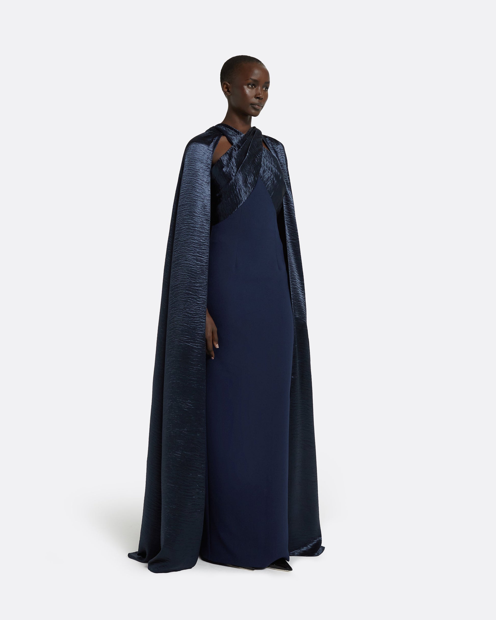 Detachable, contrast cape dress in maritime Heavy Crepe and Crushed Satin.
