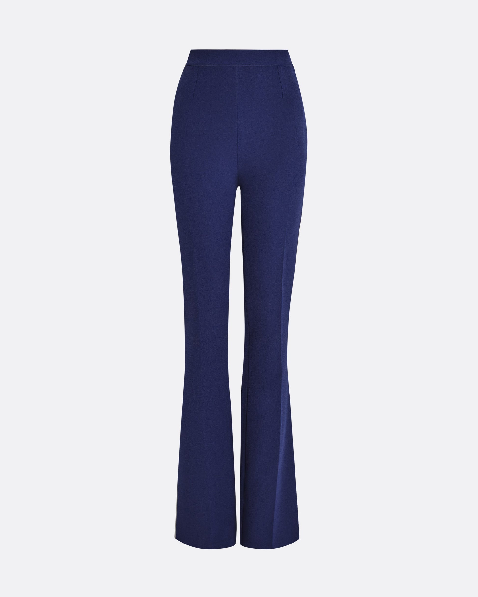 Flared leg, high waist trouser with tuxedo side detail in maritime Satin Back Crepe on oxford blue Heavy Crepe.