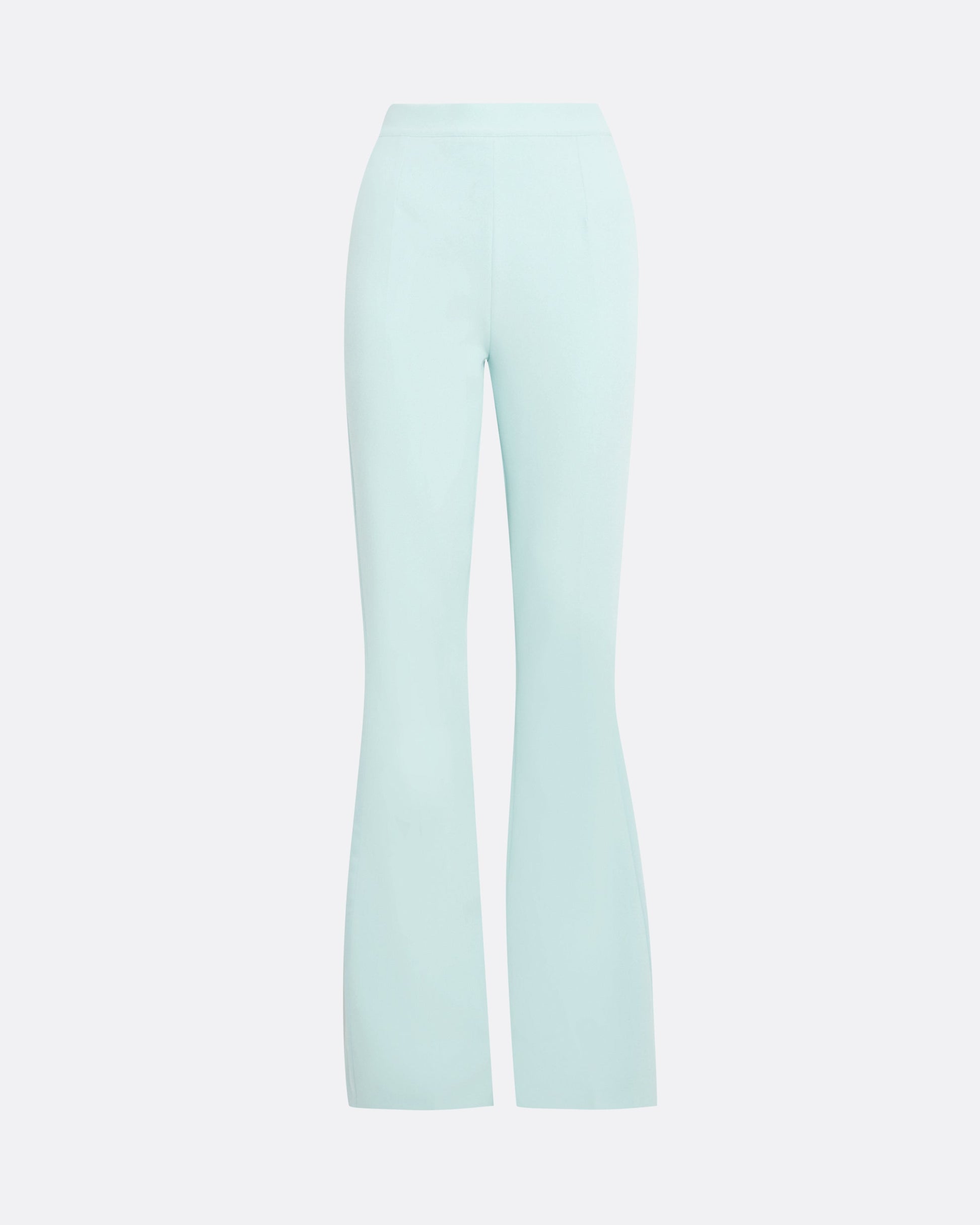 Flared leg, high waist trouser with tuxedo side detail in baby blue Heavy Crepe and Shine Satin Stretch.