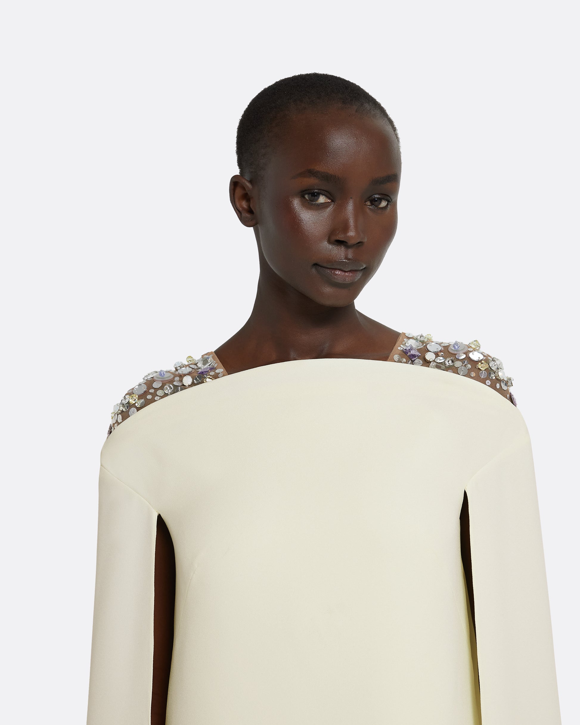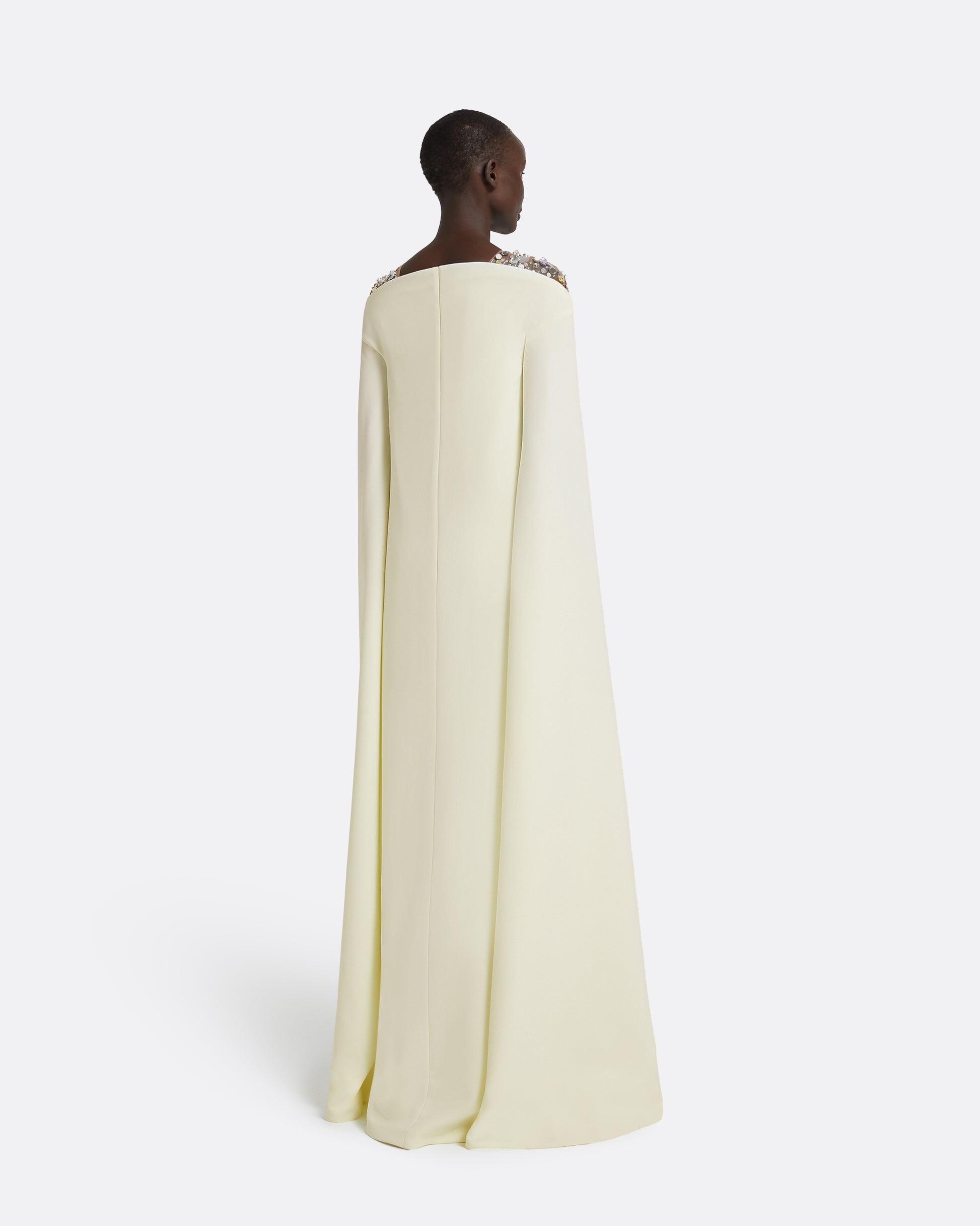 Shoulder detailed, cape gown in sorbet Heavy Crepe with multi-pastel Elisabetta embroidery.