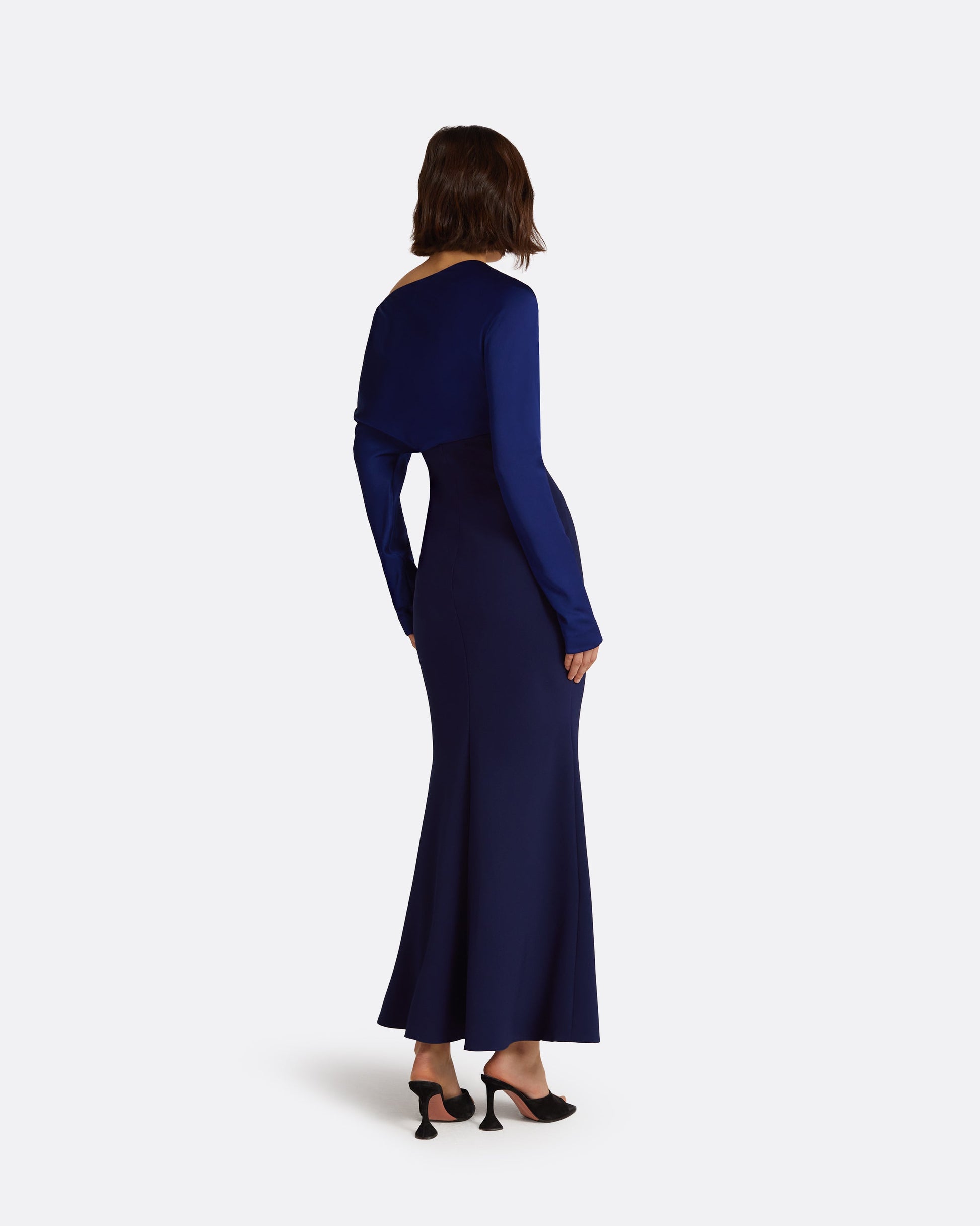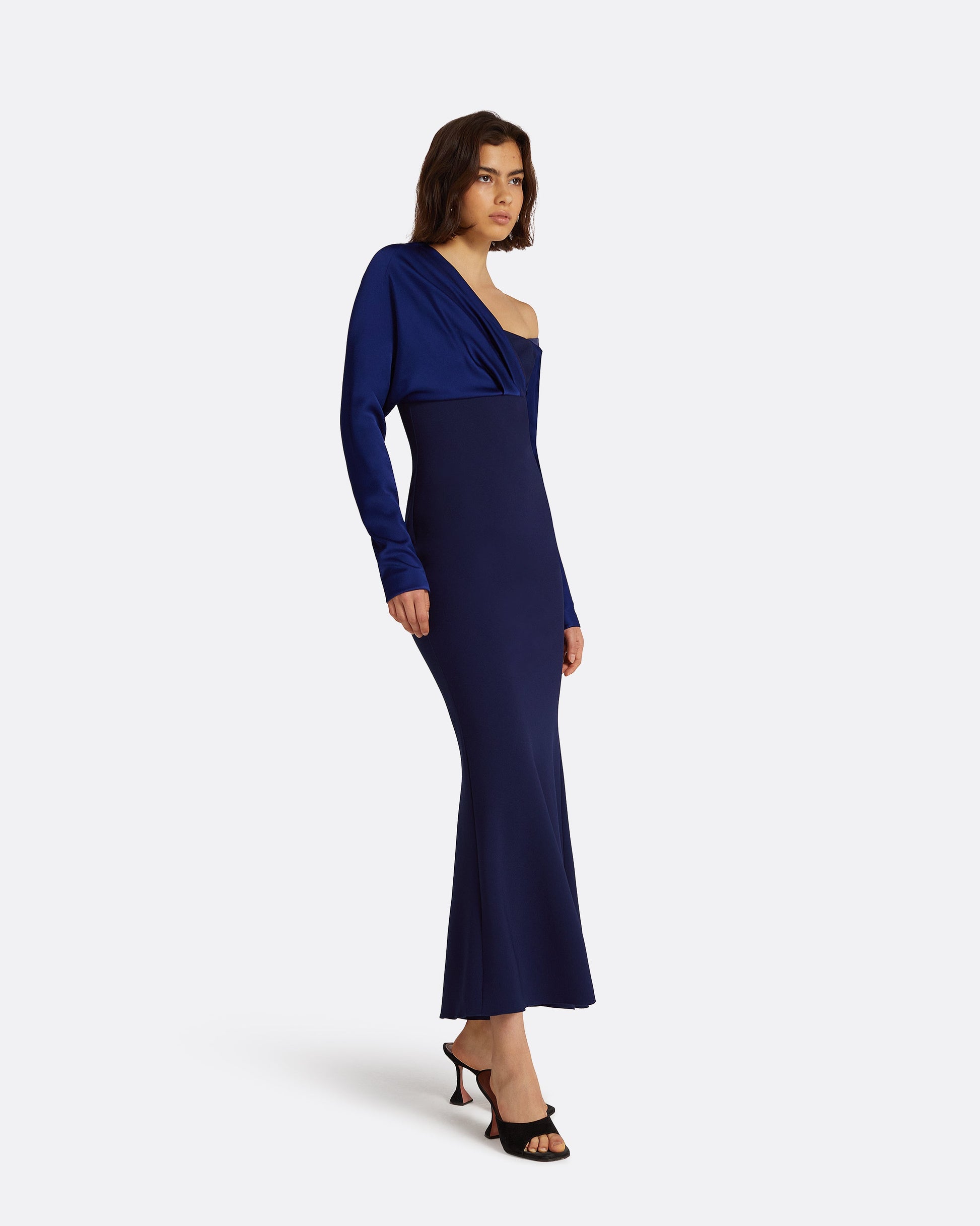 Off shoulder cocktail dress with kick flare skirt and contrast sleeve detail in maritime Satin back Crepe on azurite Heavy Crepe.