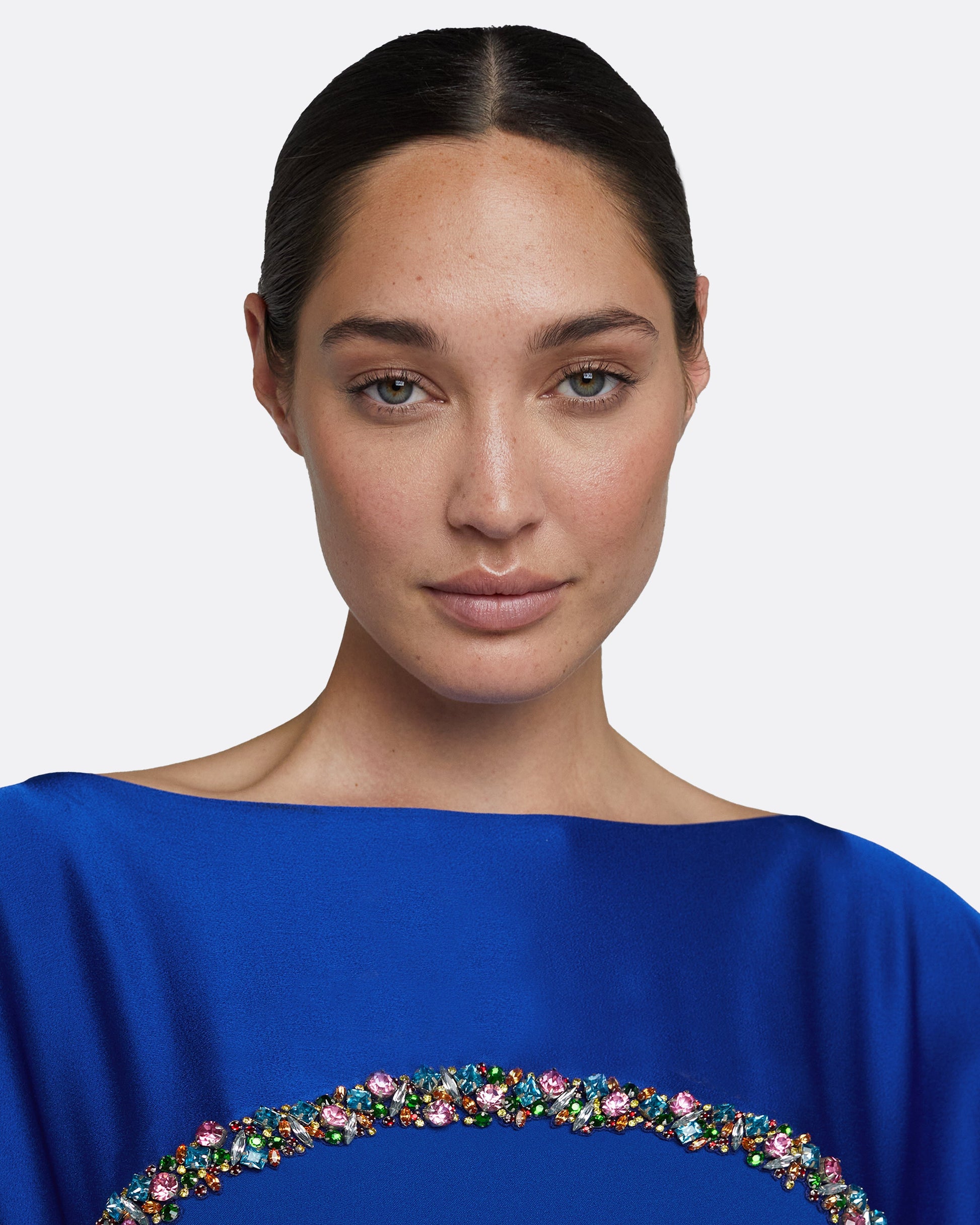 Flattering floor length kaftan with contrast chest detail in Marrakech Heavy Crepe and Satin Back Crepe, with multi-brights Crystal Trim embroidery.