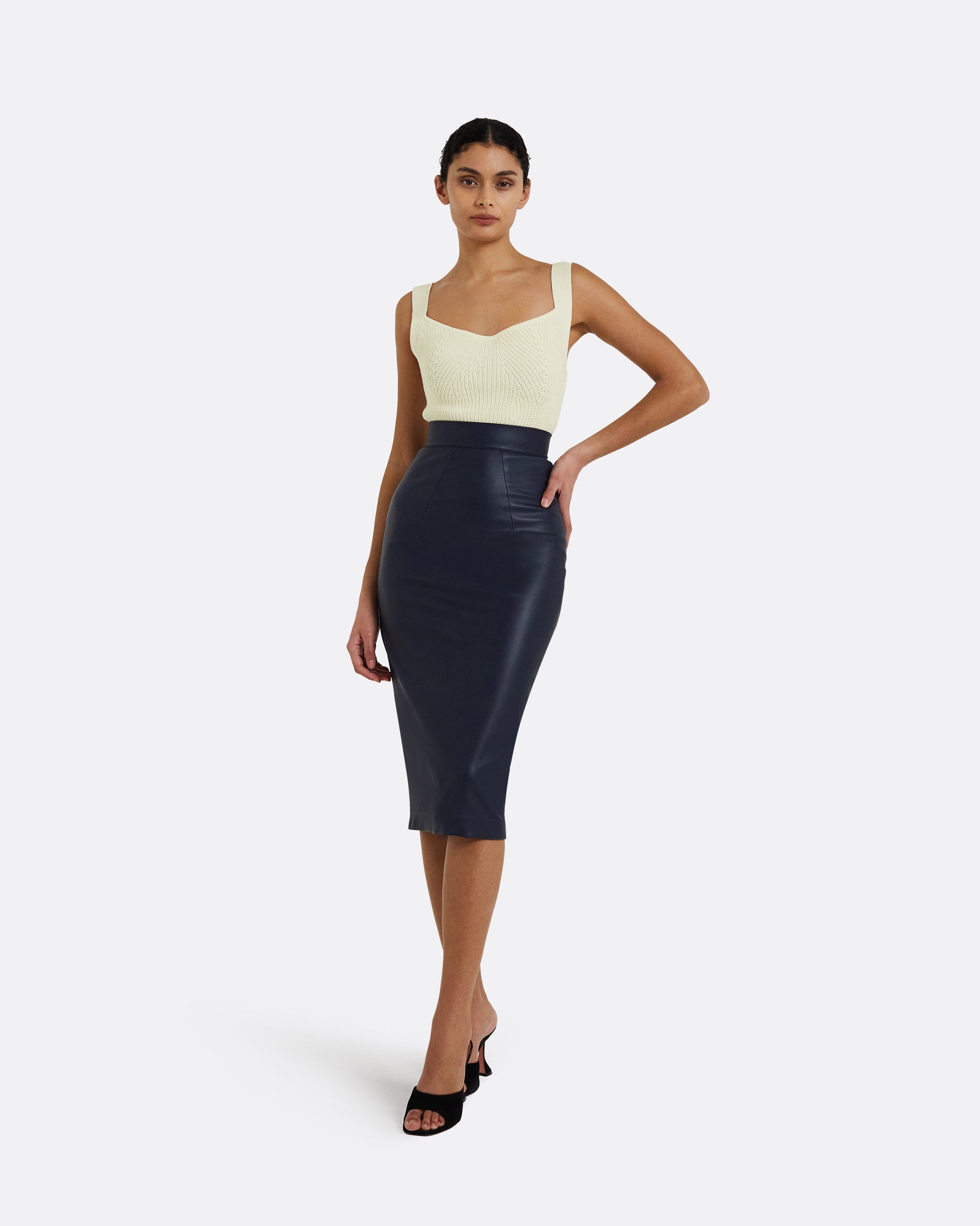 Styled with the Hokoku skirt in navy Vegan Leather.