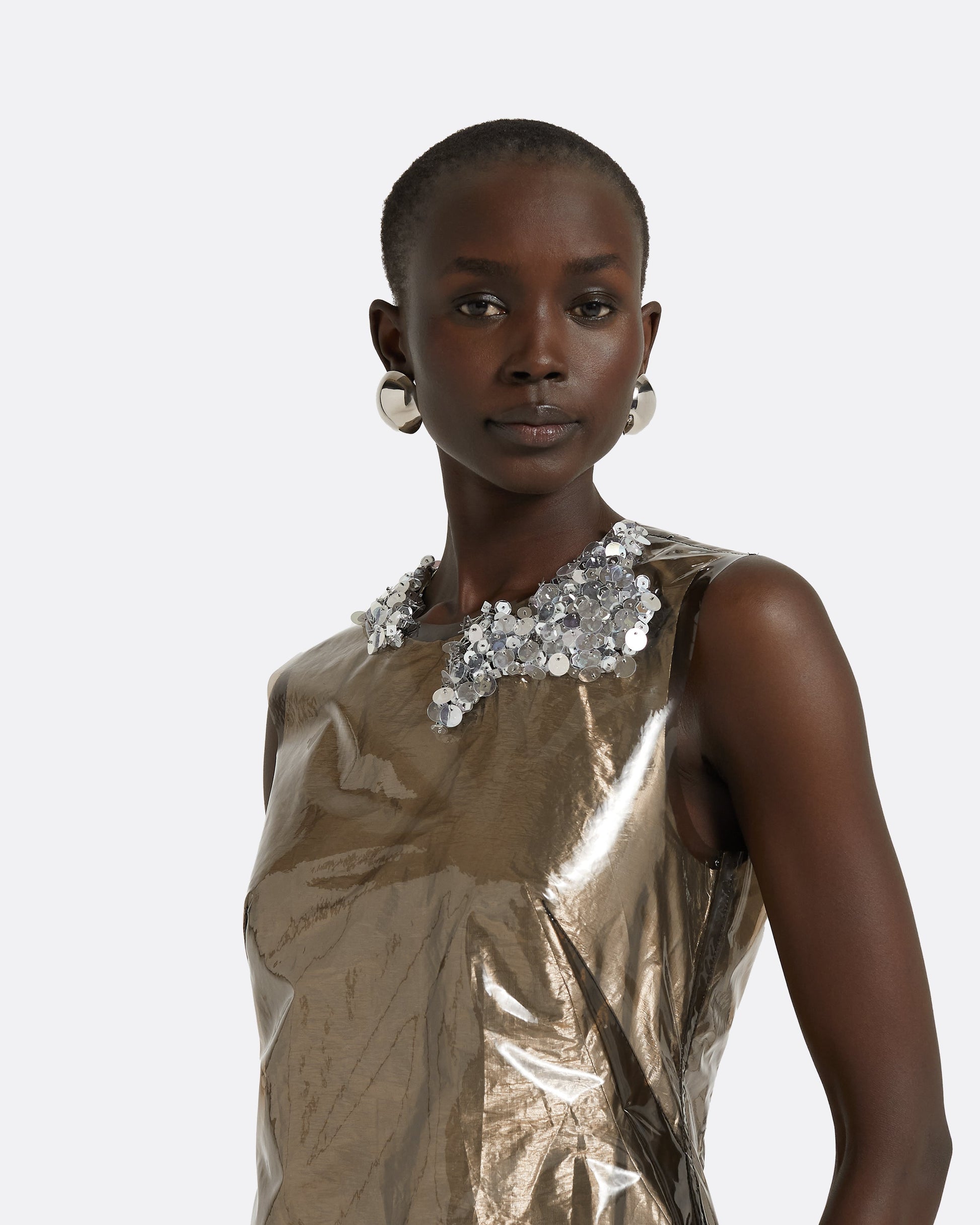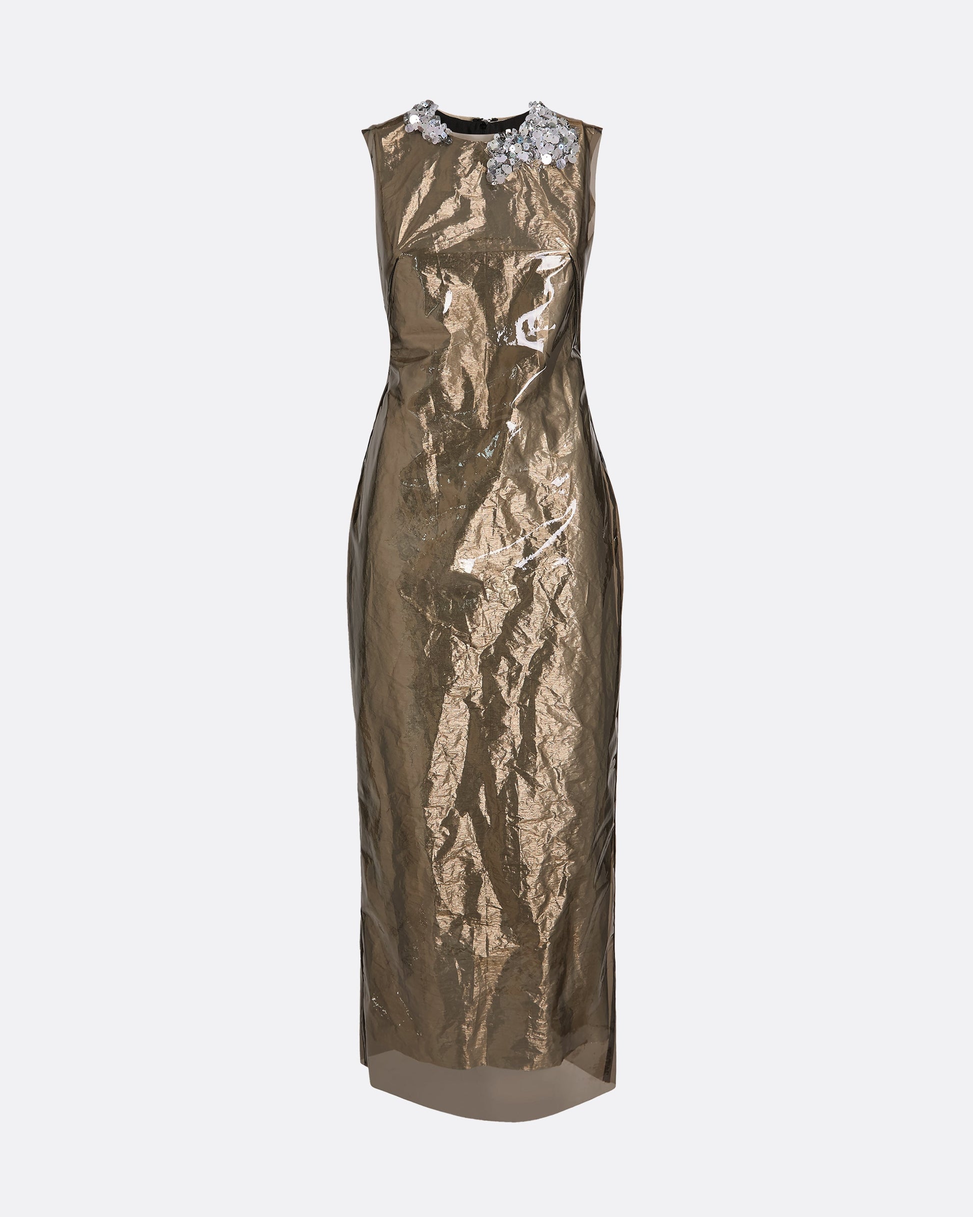 Striking, layered mid-calf sheath dress in astronaut Crushed Metallic on taupe Transparent PVC, with silver Fisher embroidery.