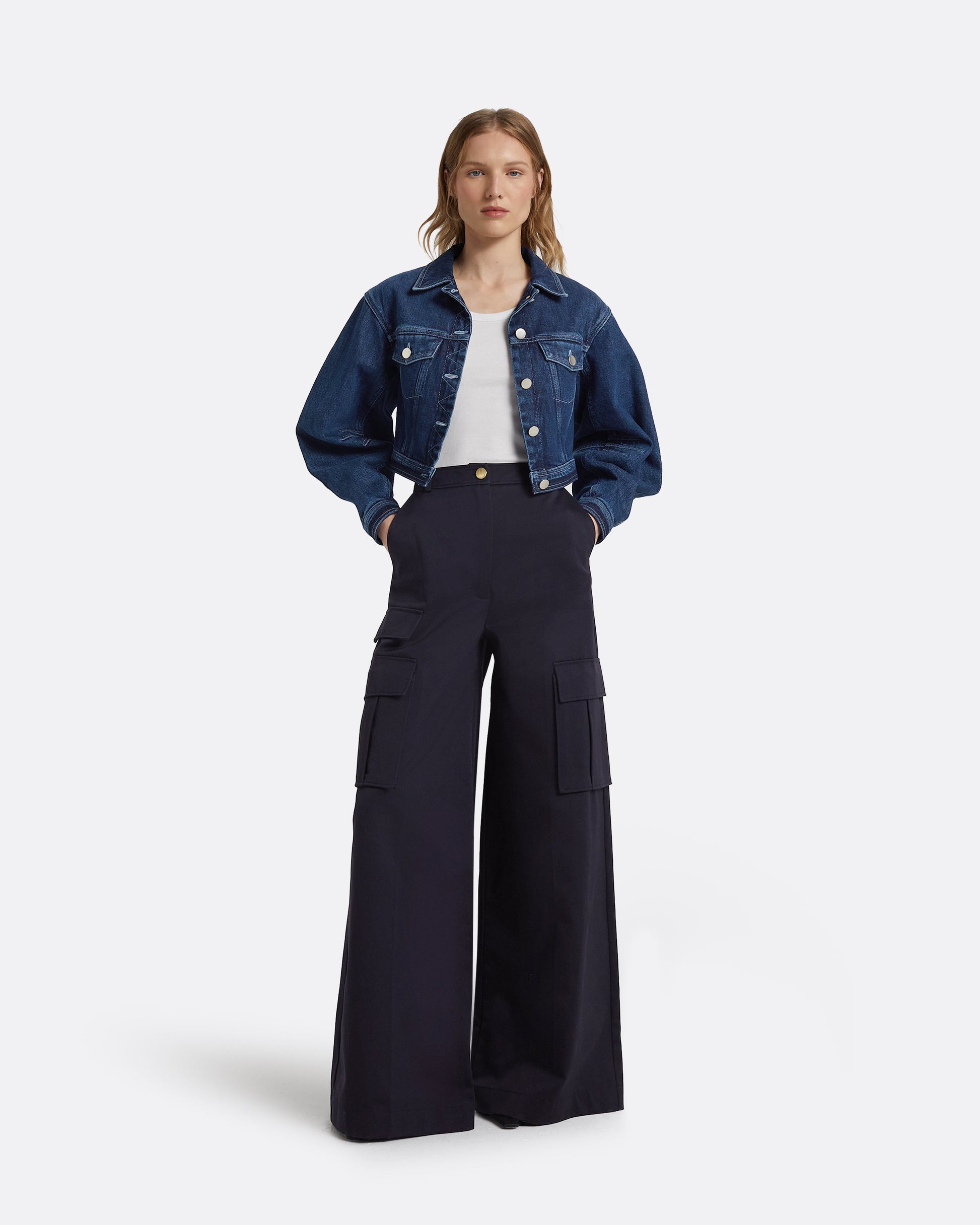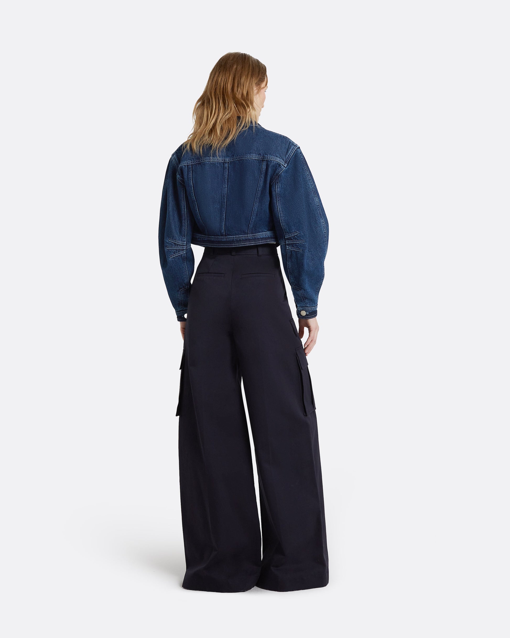 Cropped denim, trucker style jacket in mid wash Indigo Denim.