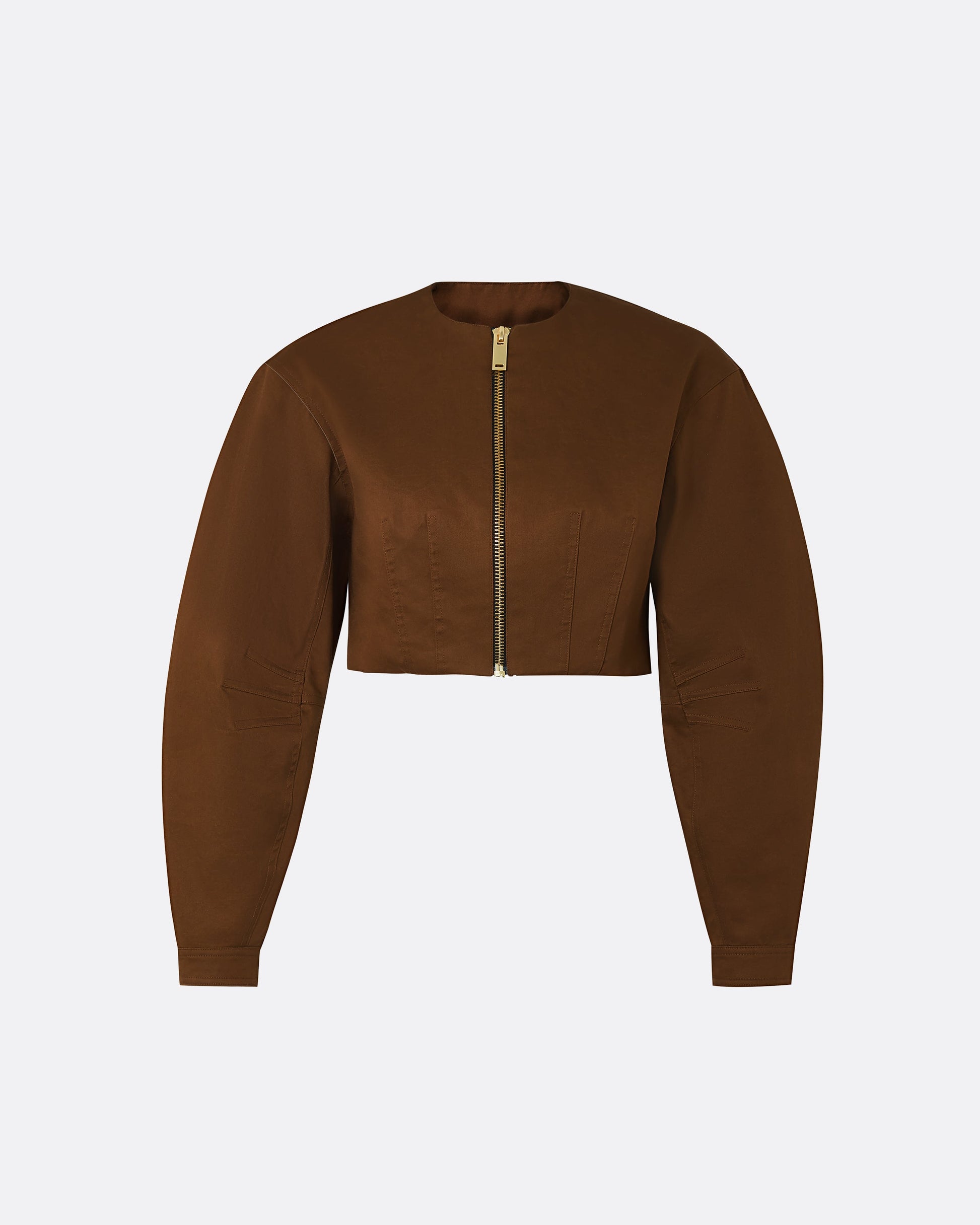 Cropped, bomber style jacket with seam detailing in deep brown Trenching.