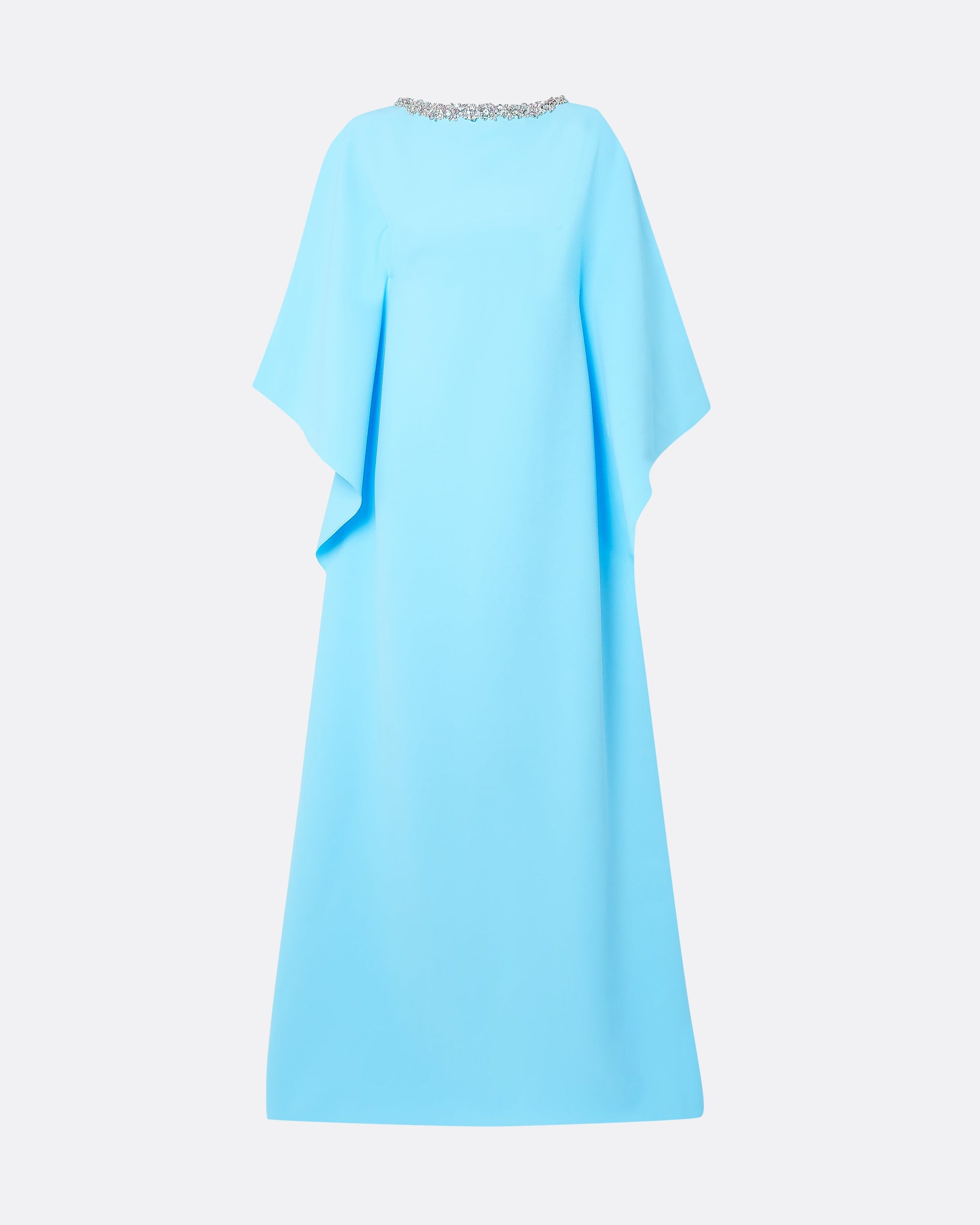 Flowing kaftan gown with flattering seam detail in topaz Heavy Crepe, with multi-pastels Crystal Trim B embroidery.