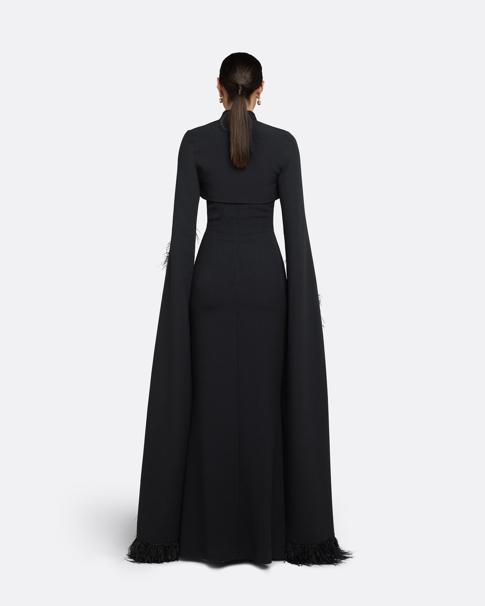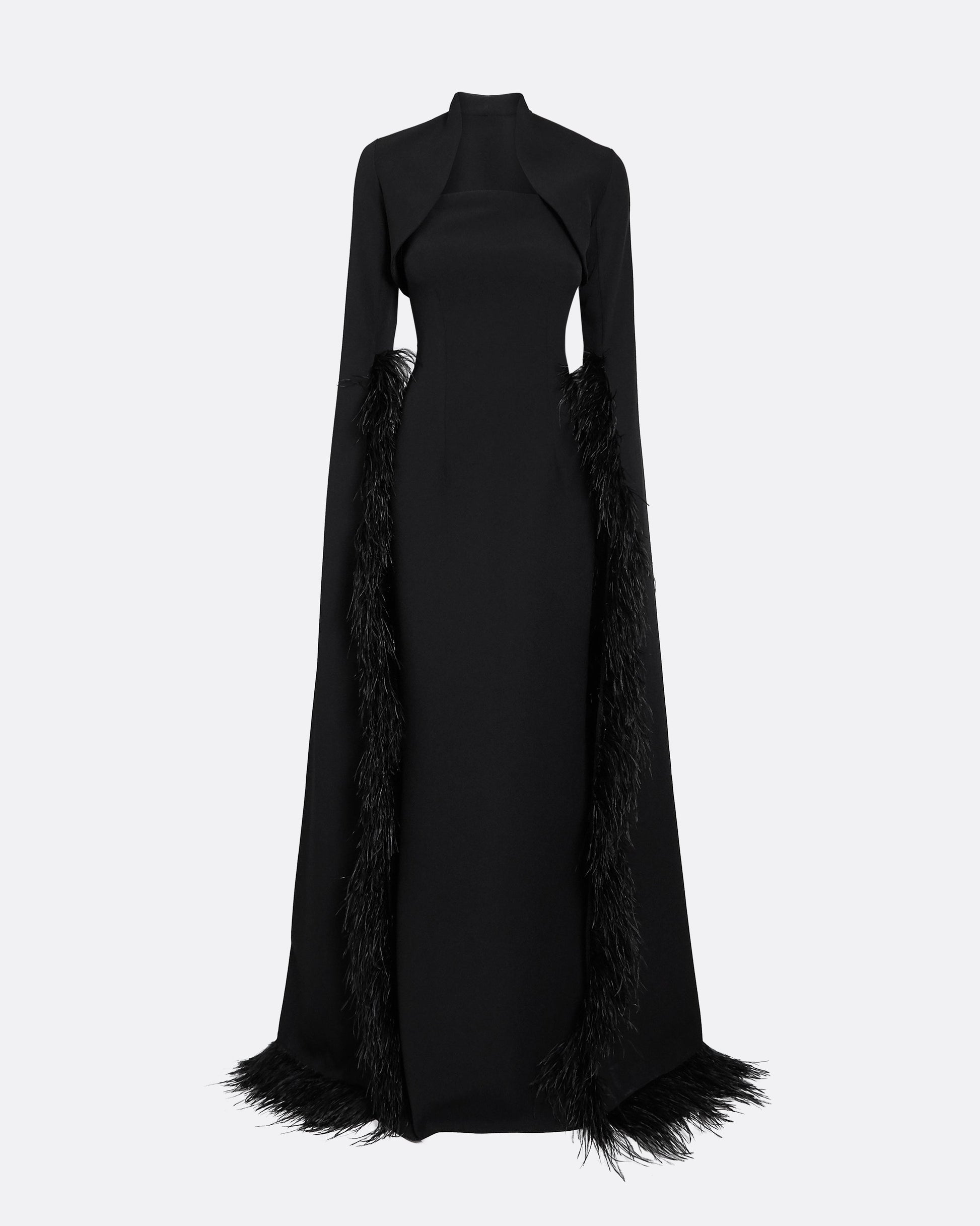 Raised collar bolero with floor length sleeves and statement feather trim, and full-length fitted strapless dress in black.