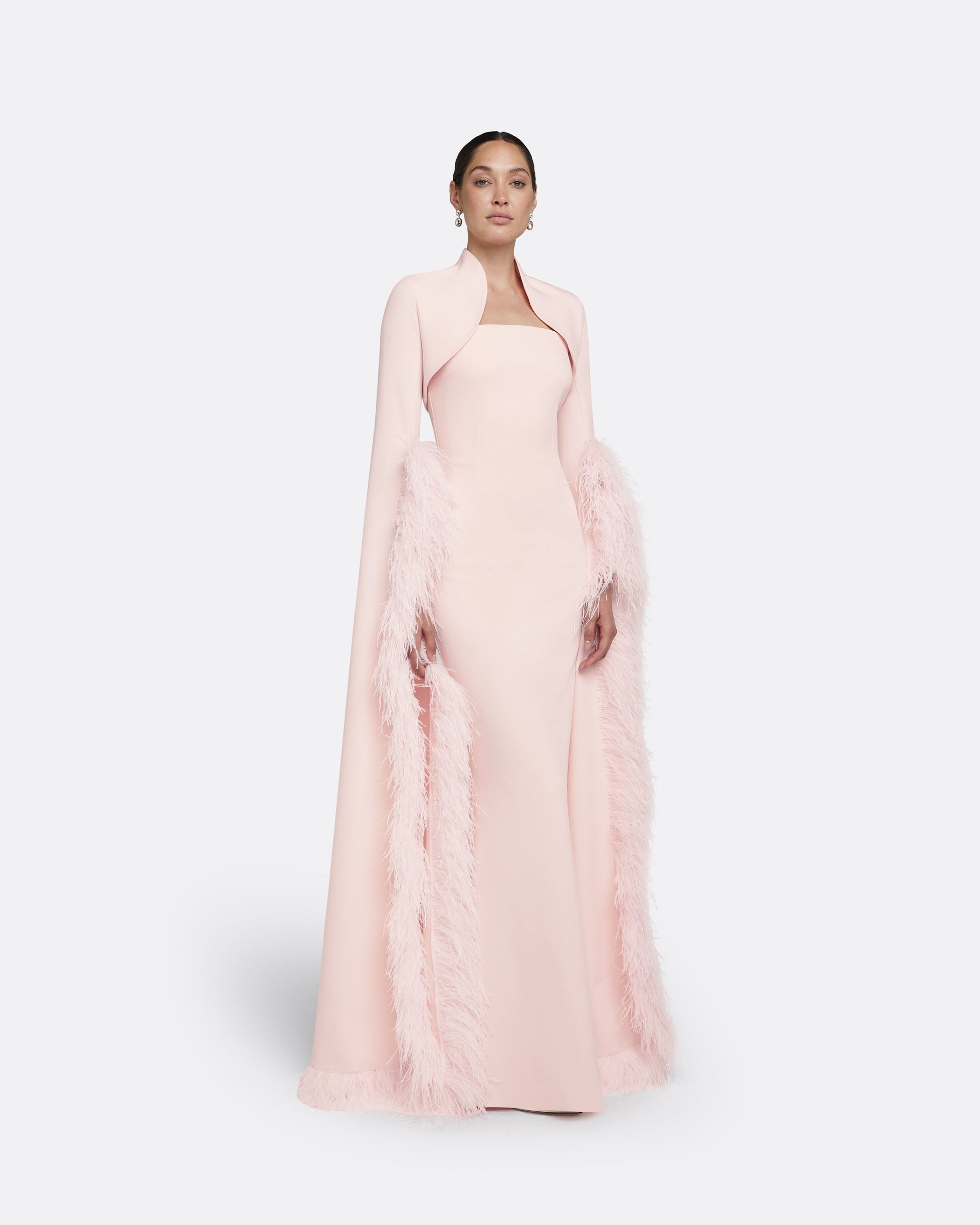 Raised collar bolero with floor length sleeves and statement feather trim, and full-length fitted strapless dress in pale pink.