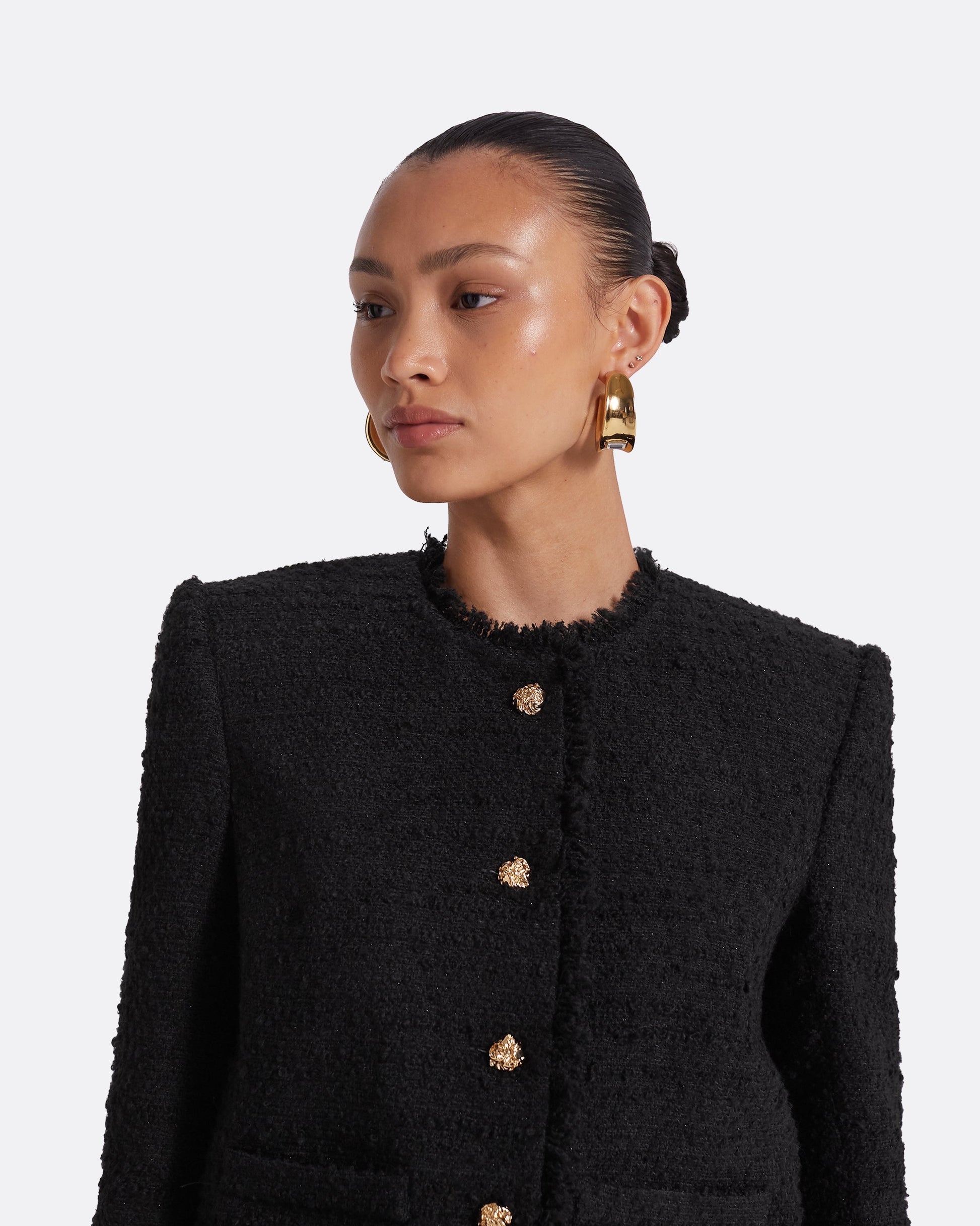 Cropped, boxy jacket with round neck in black Munich Tweed.
