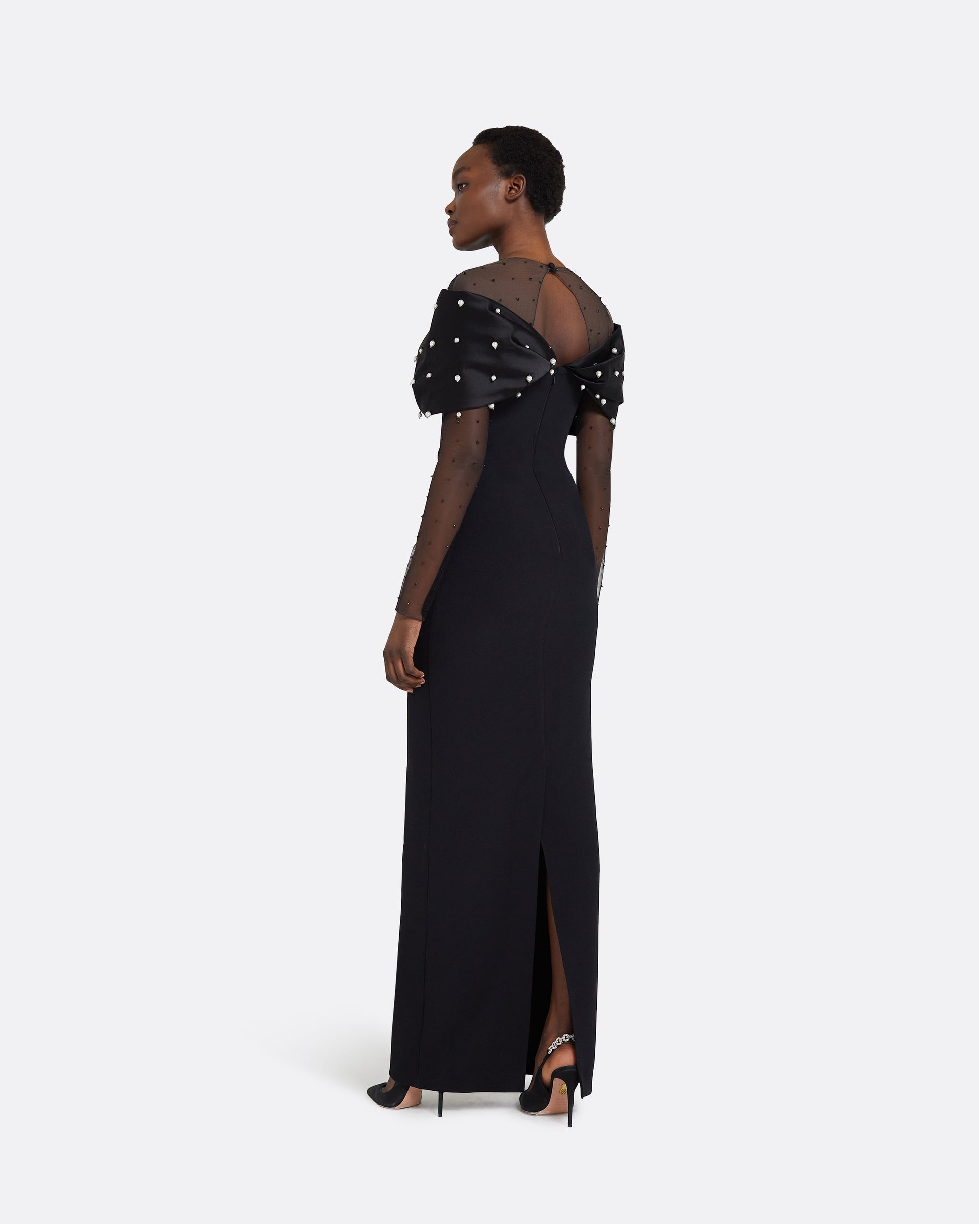 Floor-length column gown with off the shoulder detail in black Duchess Silk and Tulle, on black Heavy Crepe with Pearl Drop embroidery.