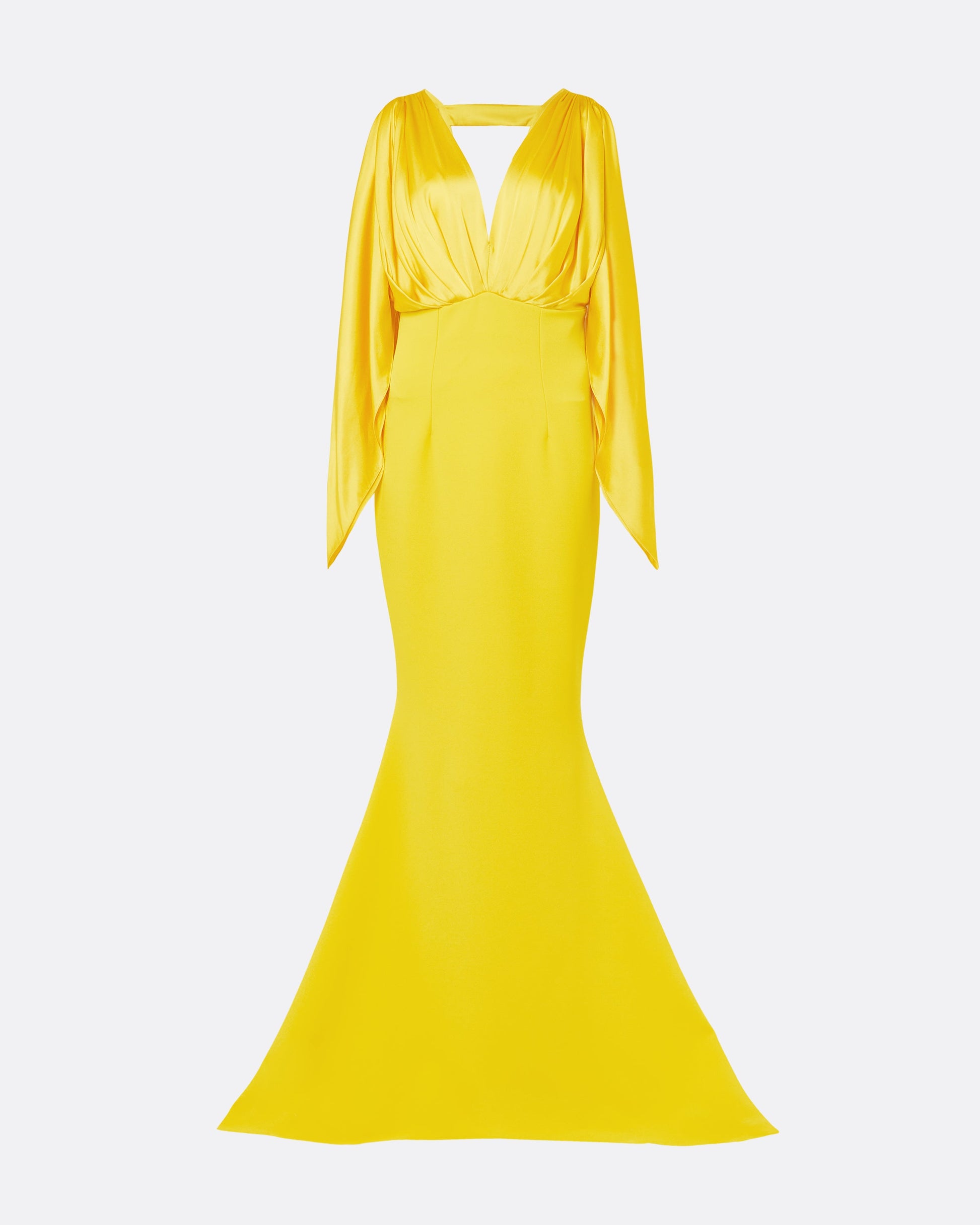 Deep V neck long dress with draped bust and sleeve detail and open V -shaped back in canary.