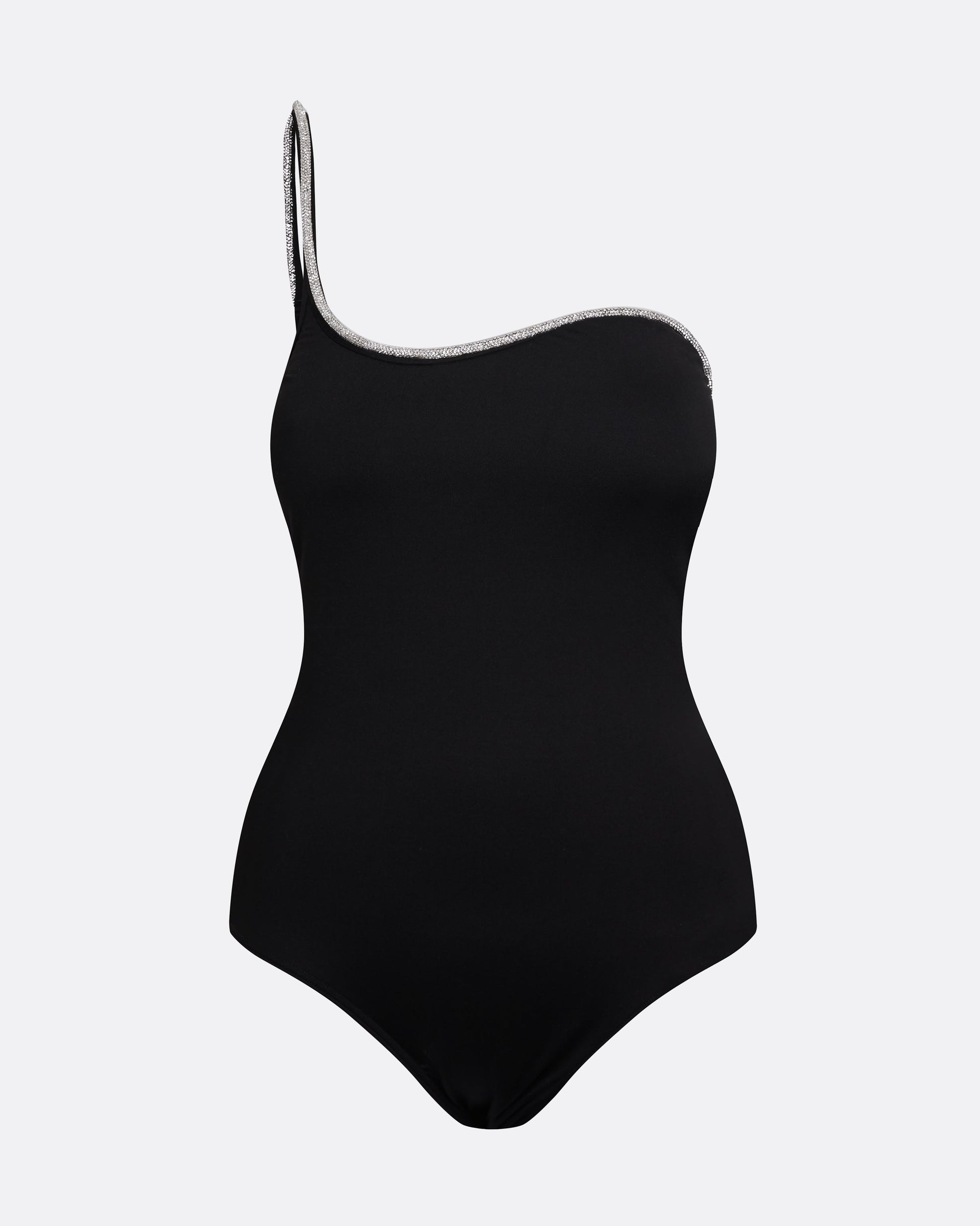 Sculpted neckline swimsuit in black Vertigo Jersey with crystal Crystal Cord embroidery.