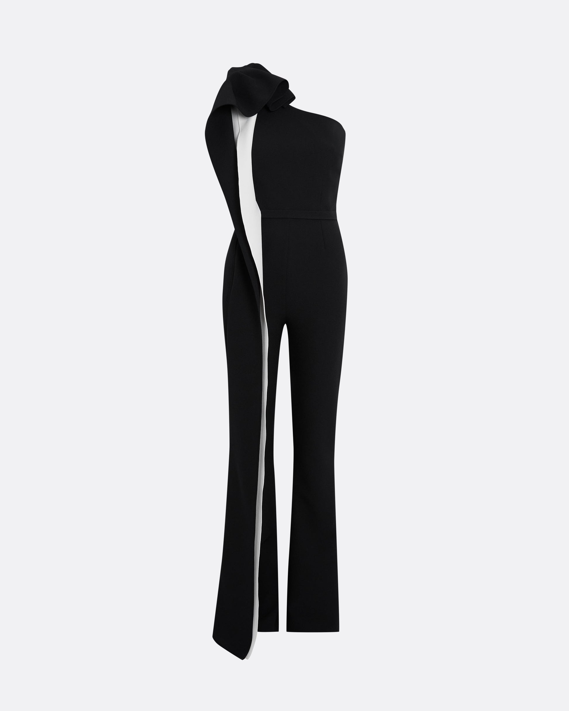 Asymmetric jumpsuit with flared leg and fluid side detail in black and ivory Heavy Crepe.