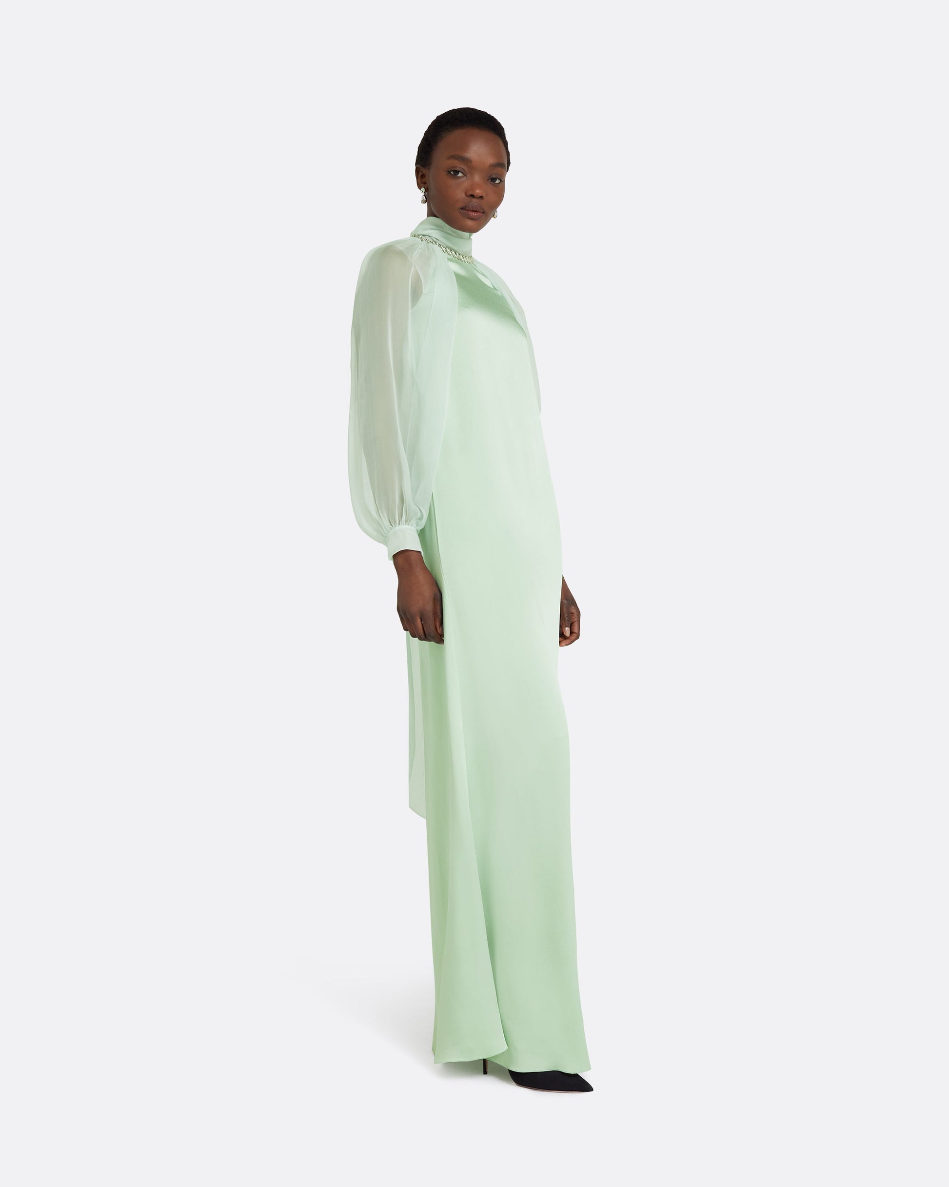 A-Line gown with neck tie and slit sleeves in aloe Satin Back Crepe and Silk Chiffon with crystal Jewel Trim embroidery.