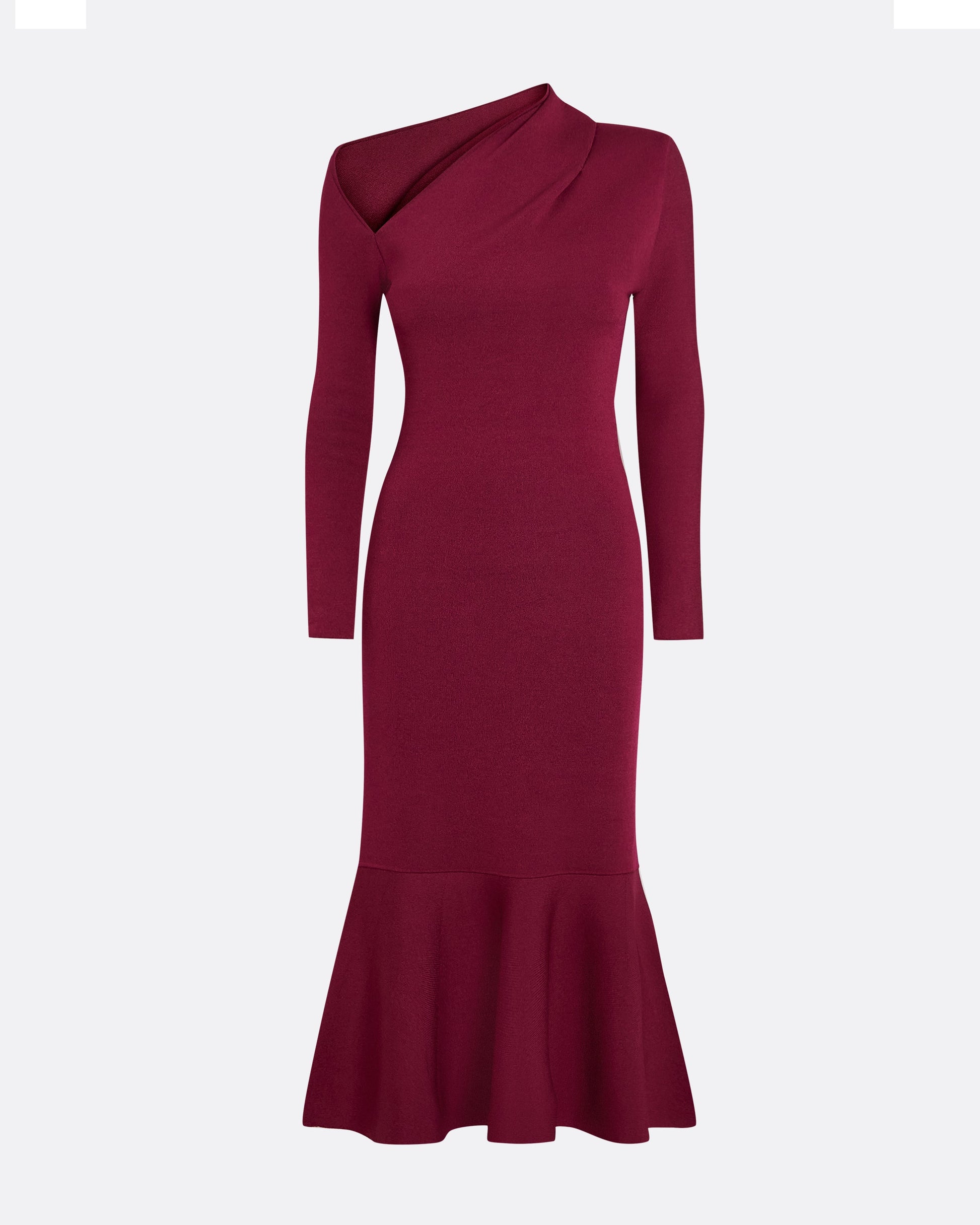 Midi dress with kick back flare skirt, long sleeves and asymmetric cutout neckline in burgundy.