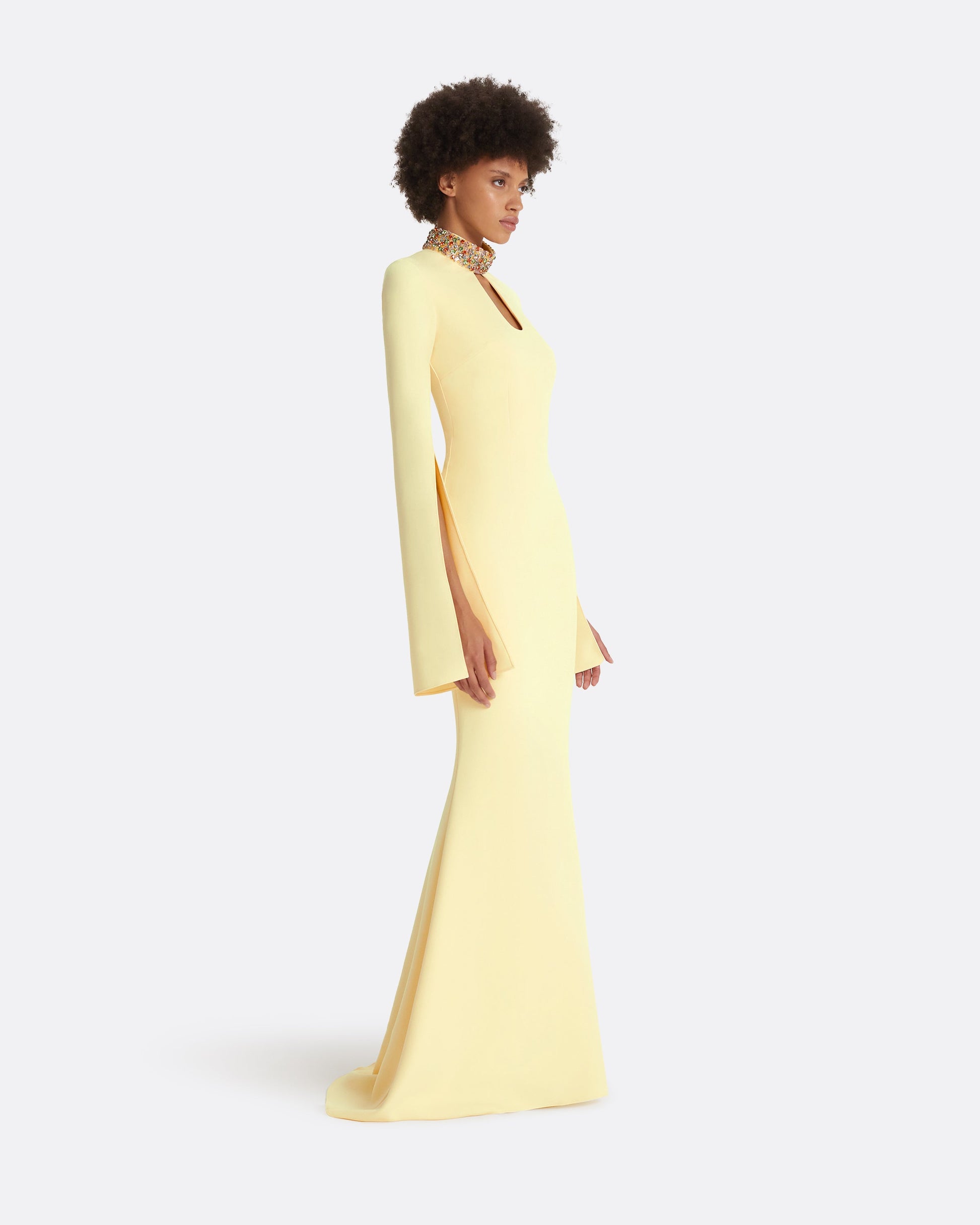 High neck, key hole, long dress with slit sleeves in pale yellow Heavy Crepe with multi-brights Serra Trim embroidery.
