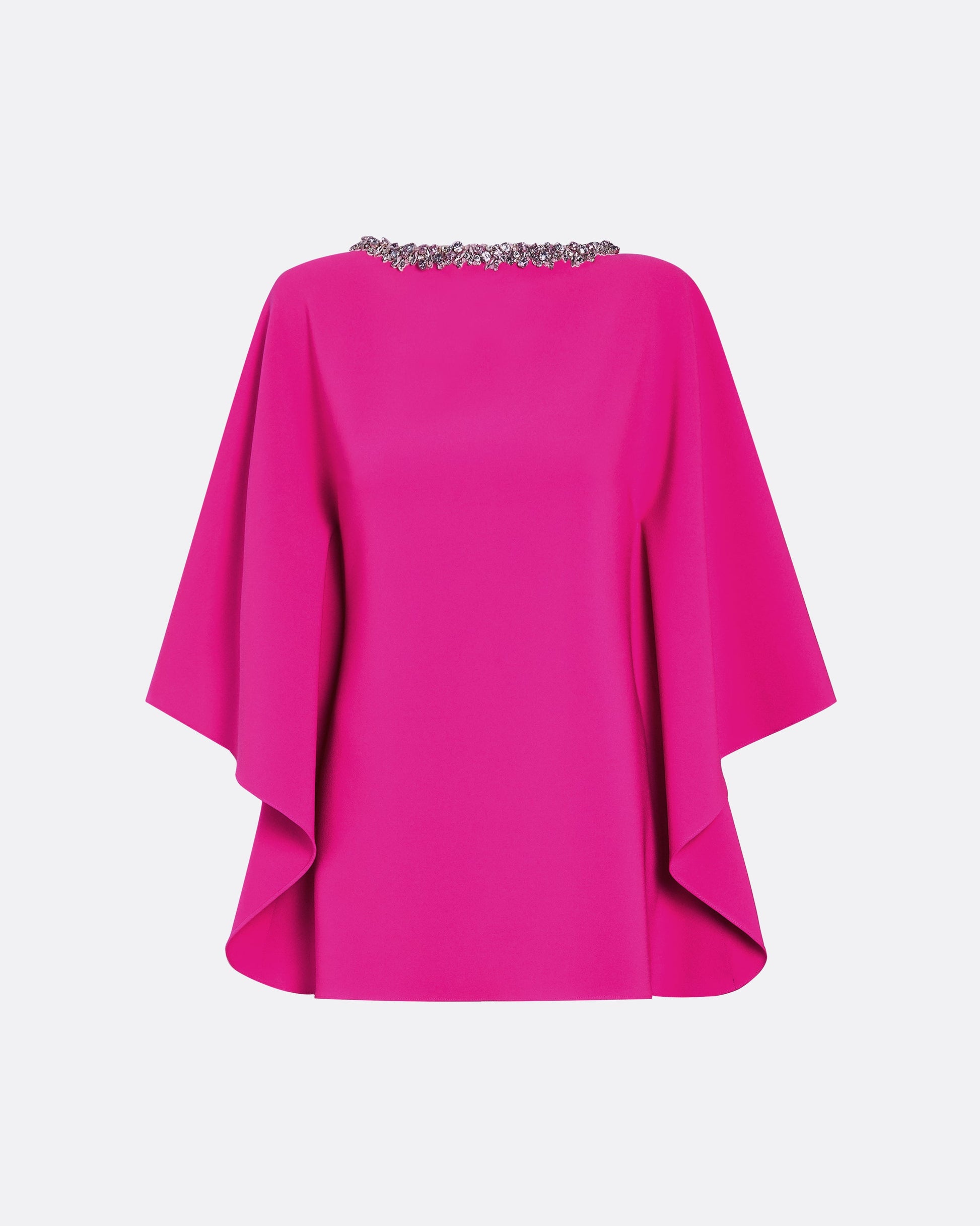 Flowing kaftan top with flattering seam detail in wild strawberryHeavy Crepe and multi-pastels Crystal Trim embroidery.