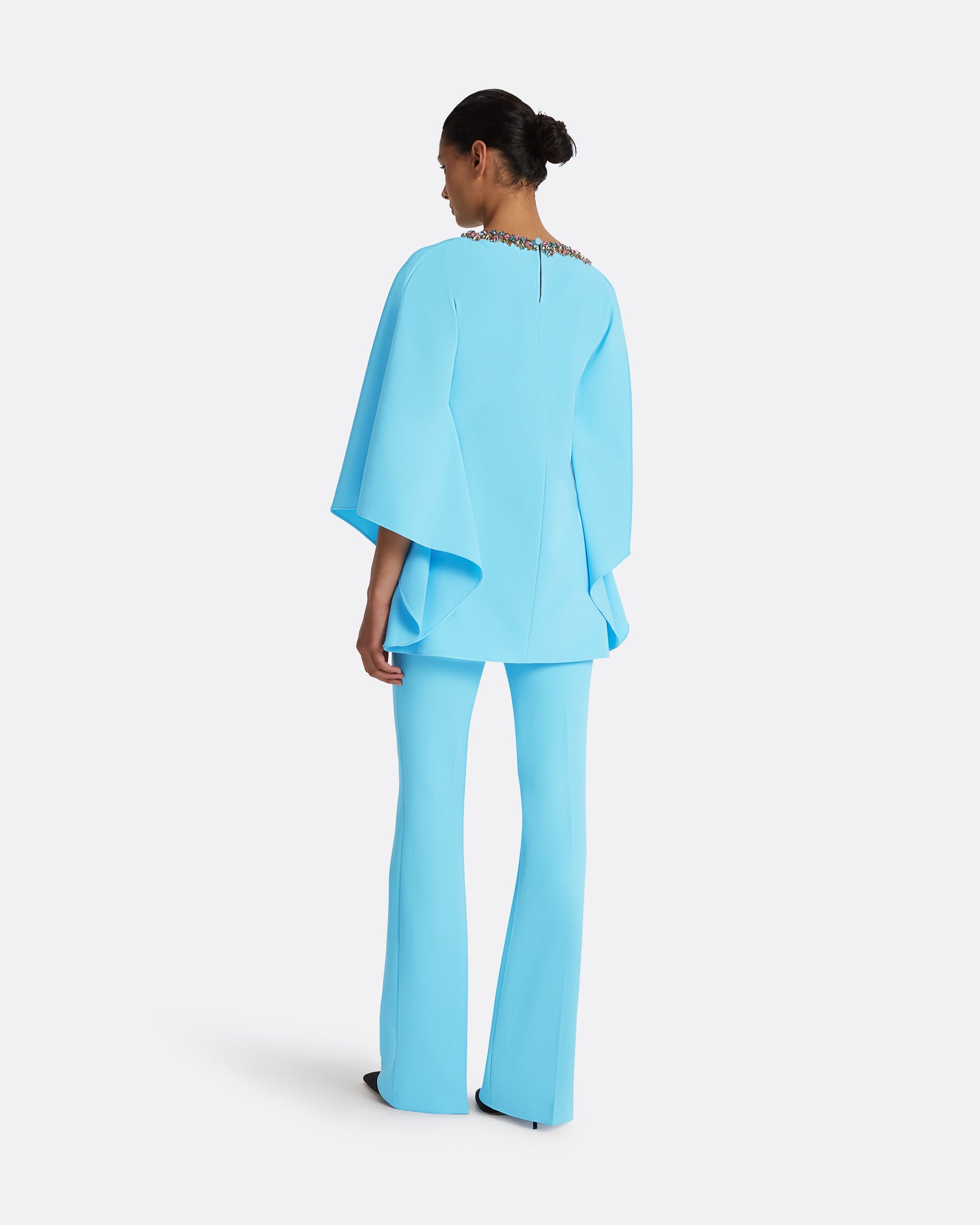 Flowing kaftan top with flattering seam detail in topaz Heavy Crepe with multi-brights Crystal Trim B embroidery.