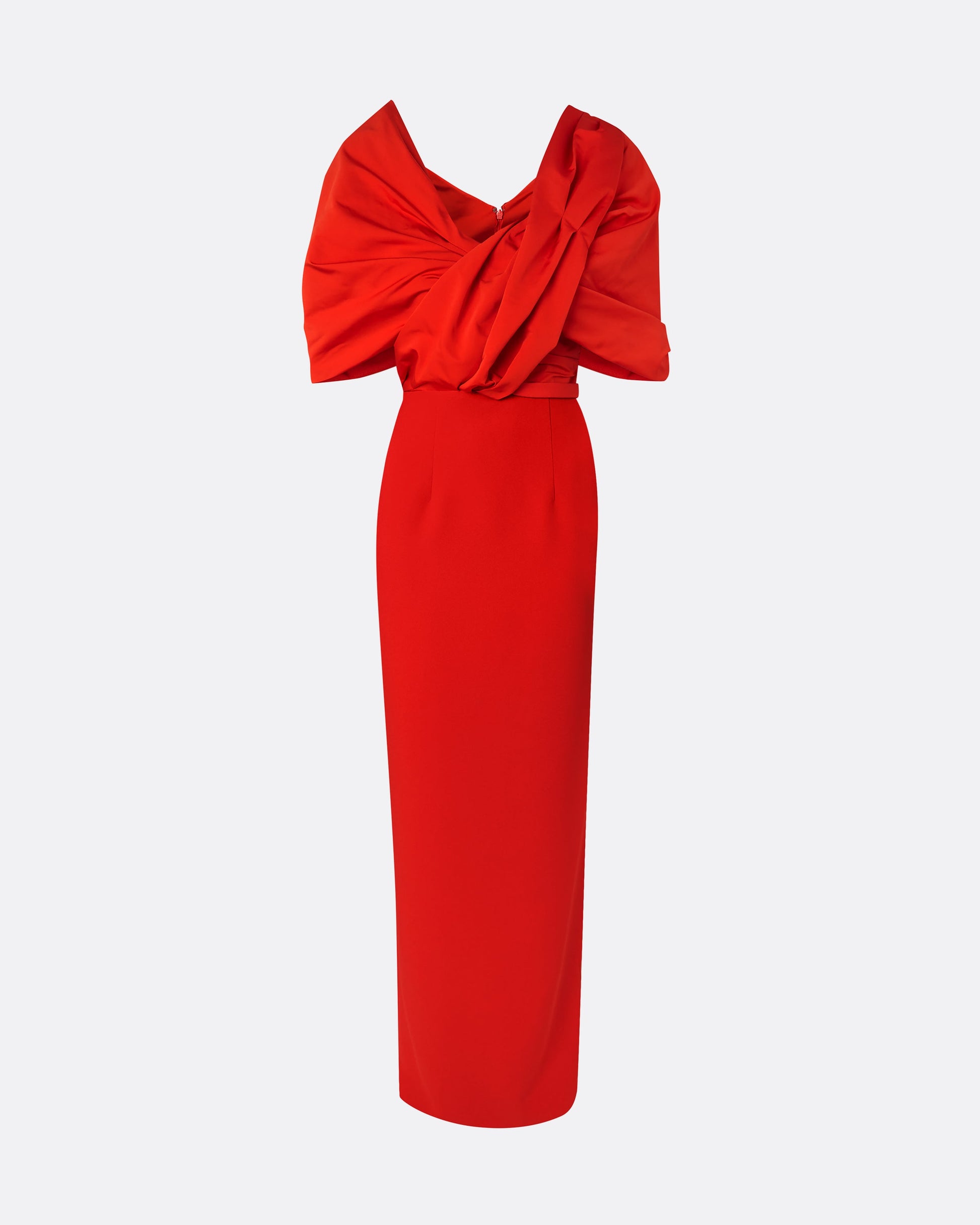 Column gown with organic, intricate drape in scarlet red Heavy Crepe and Faille.