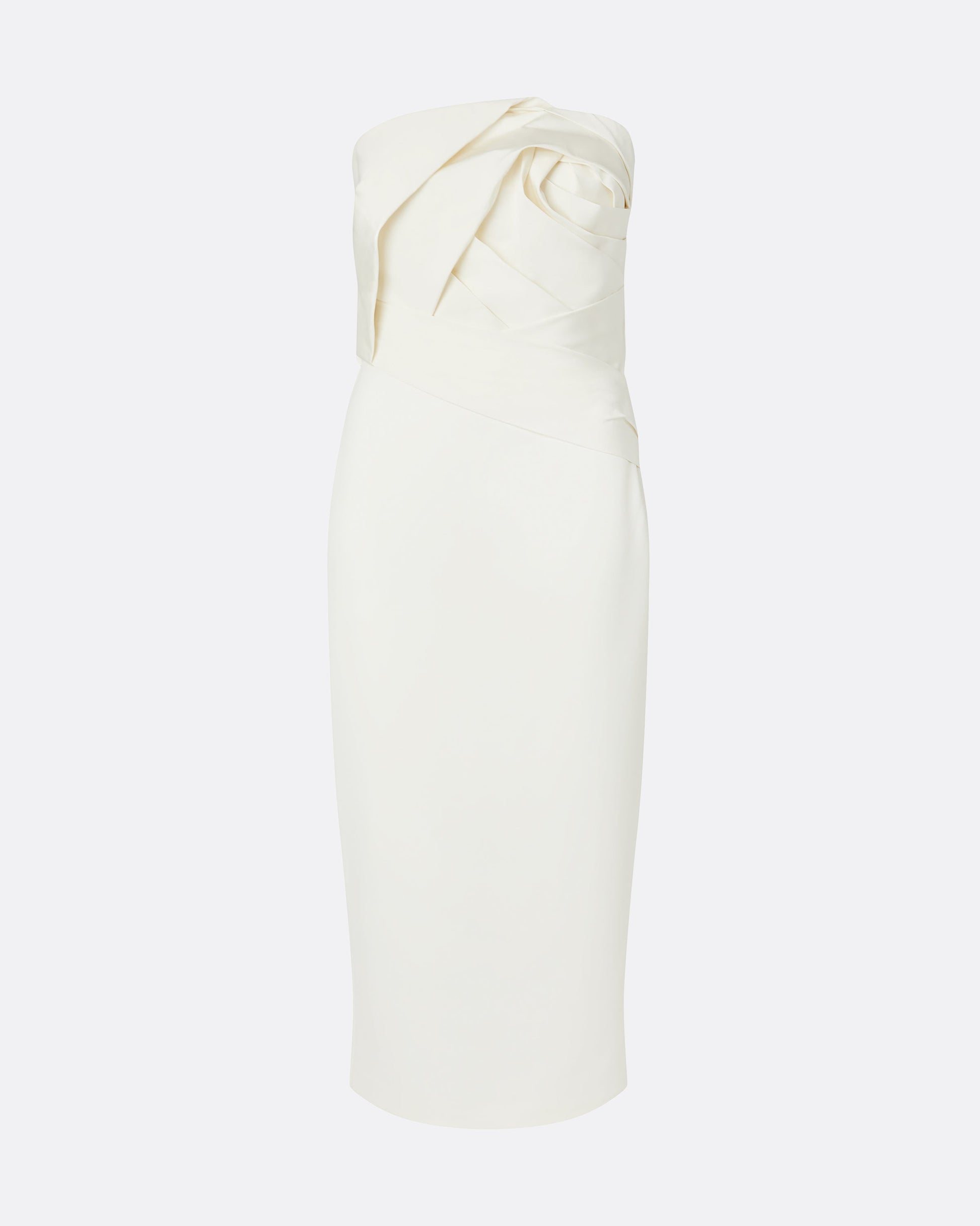 Sleeveless, cocktail dress with rose drape in ivory Heavy Crepe.
