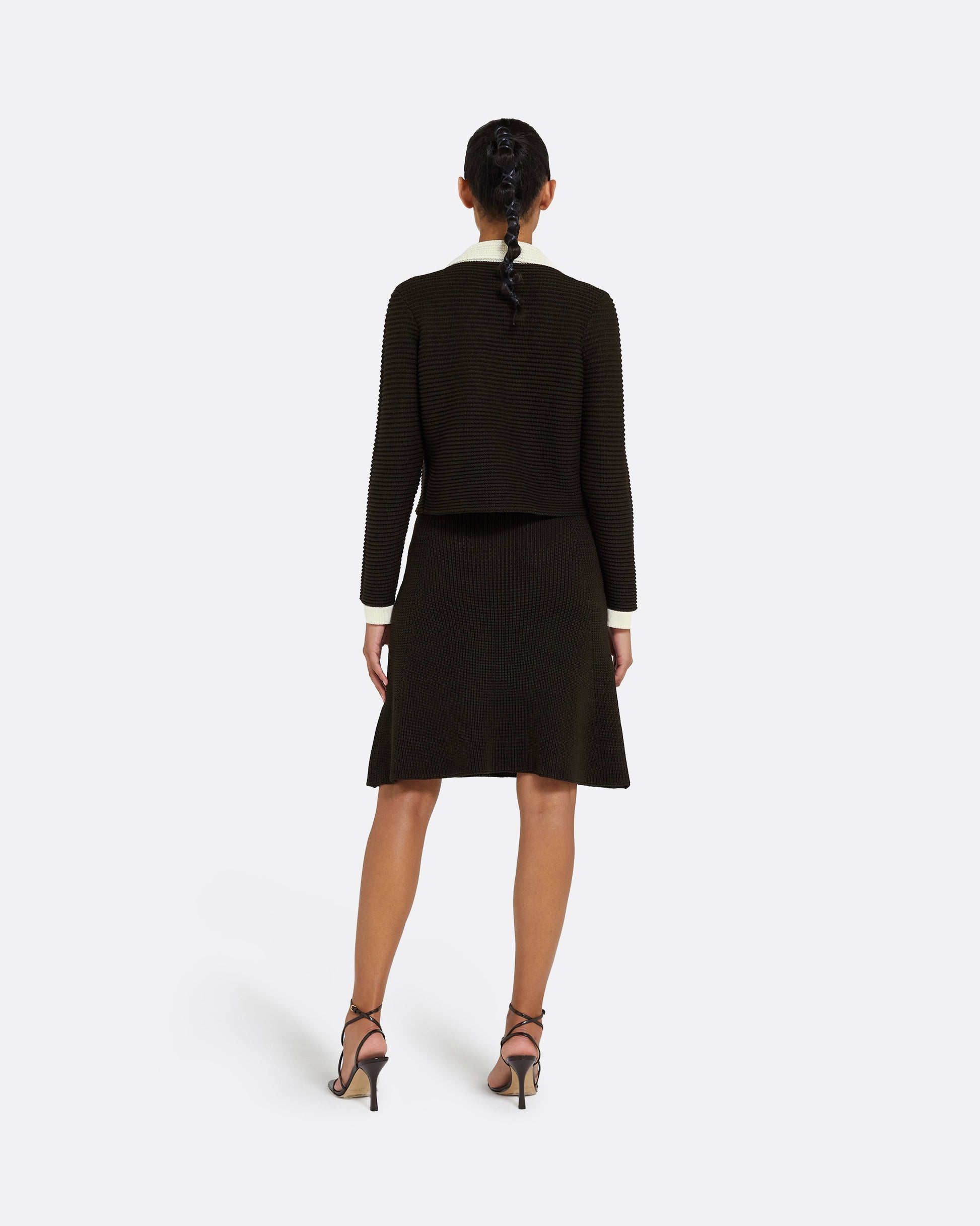 Long sleeve, straight cut jacket with collar in dark mocha and ivory crochet.