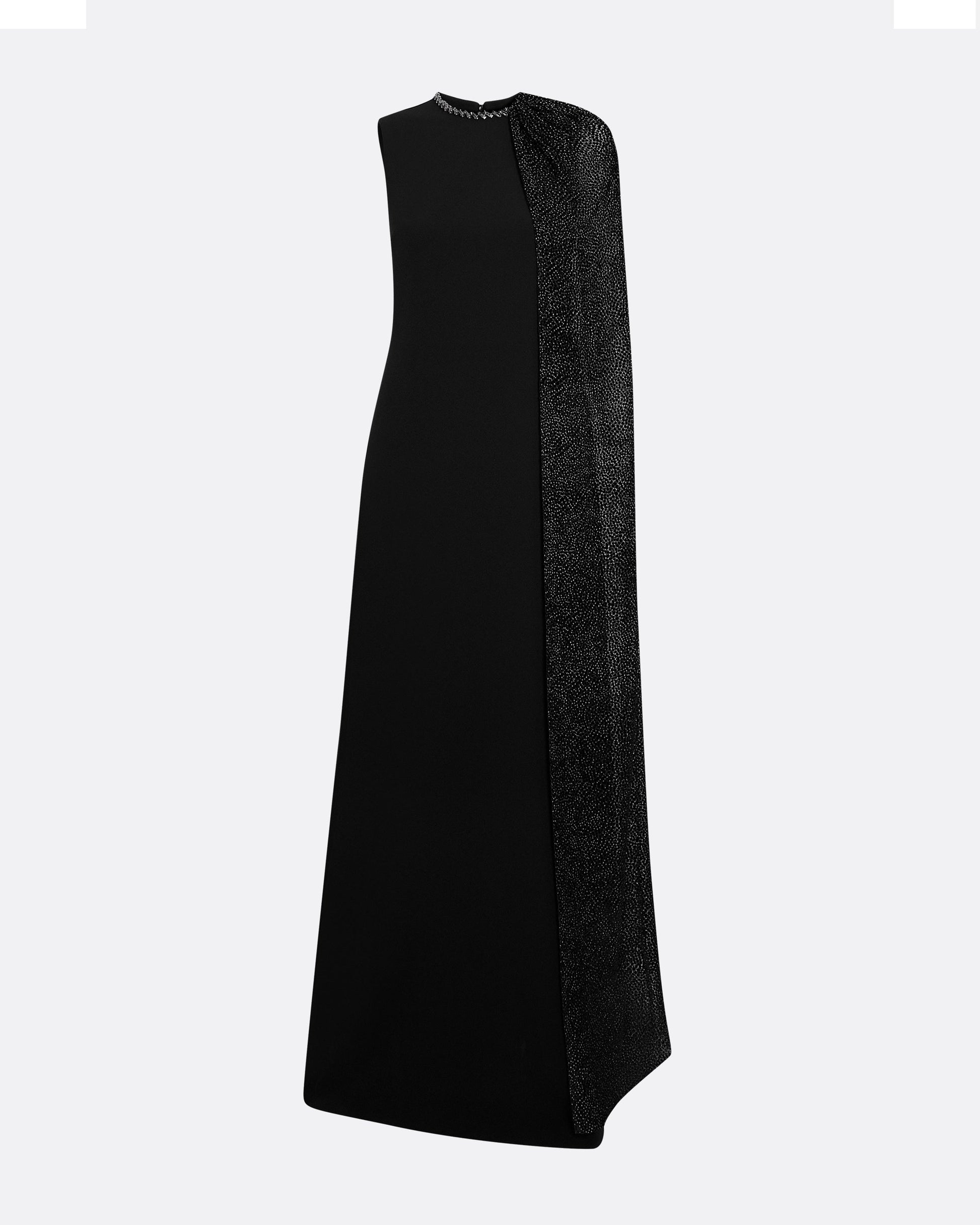 Crew neck long dress with asymmetric cape overlay in black Heavy Crepe and Spotted Devore, with smoke Jewel Trim embroidery.