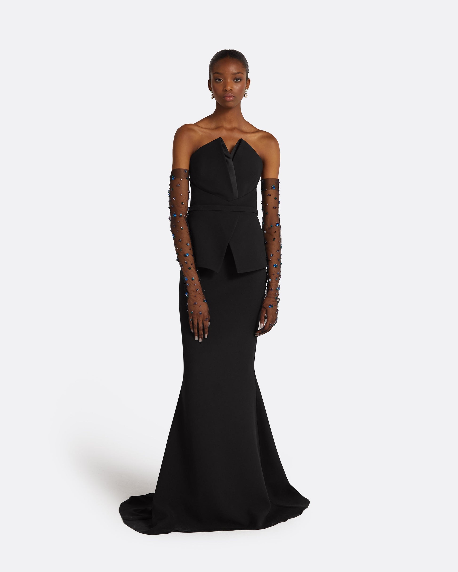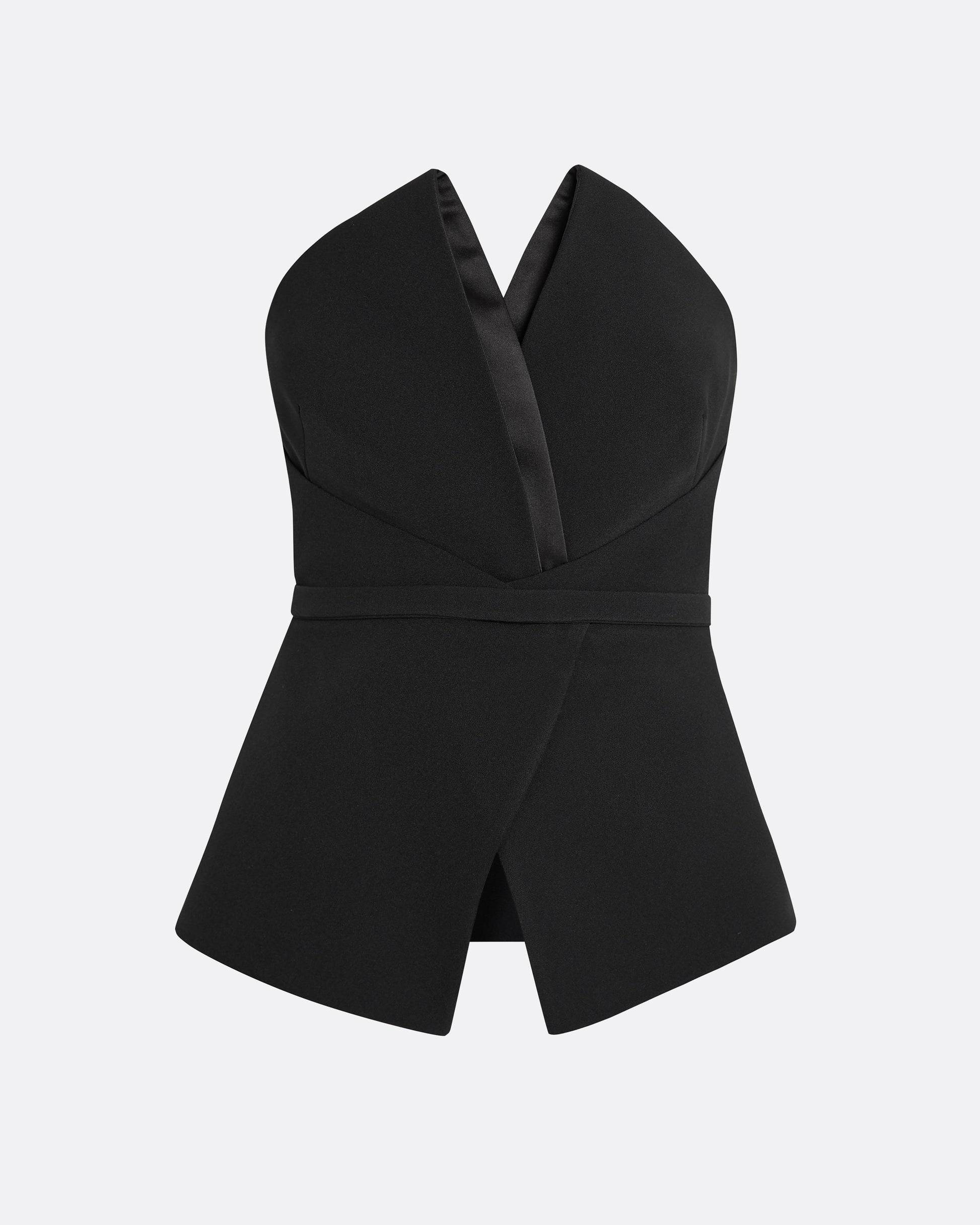 Bustier top with split peplum and fold over bust detail in black Heavy Crepe and Shine Satin Stretch.