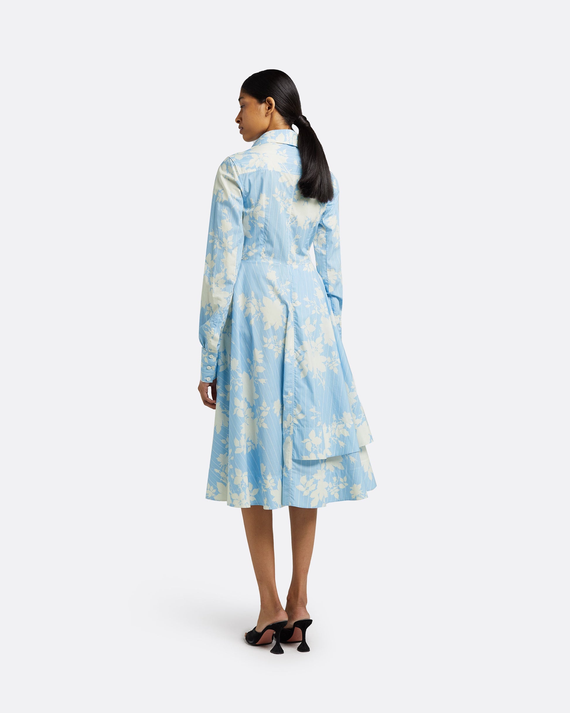 Deconstructed A line shirt dress with long sleeves and waist drape in pale blue and white Rose Cotton.