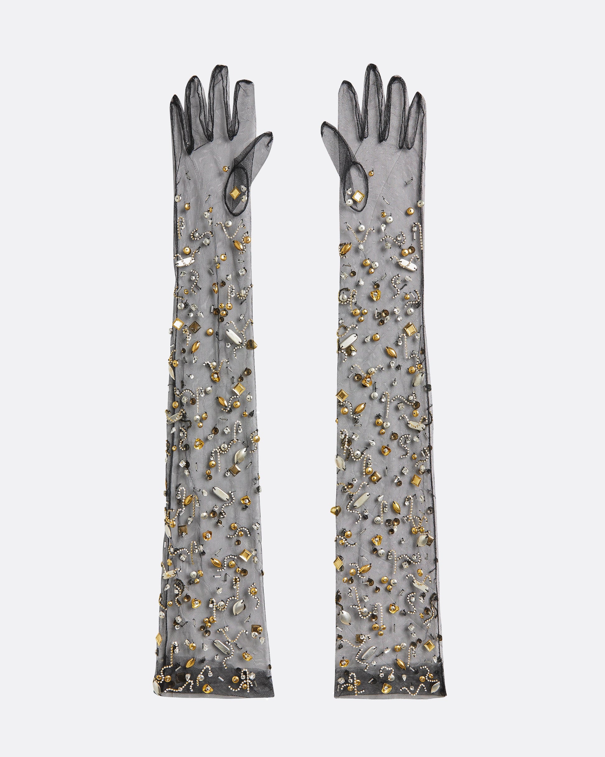 Long line gloves in black Tulle with silver/gold Celestial Scatter embroidery.