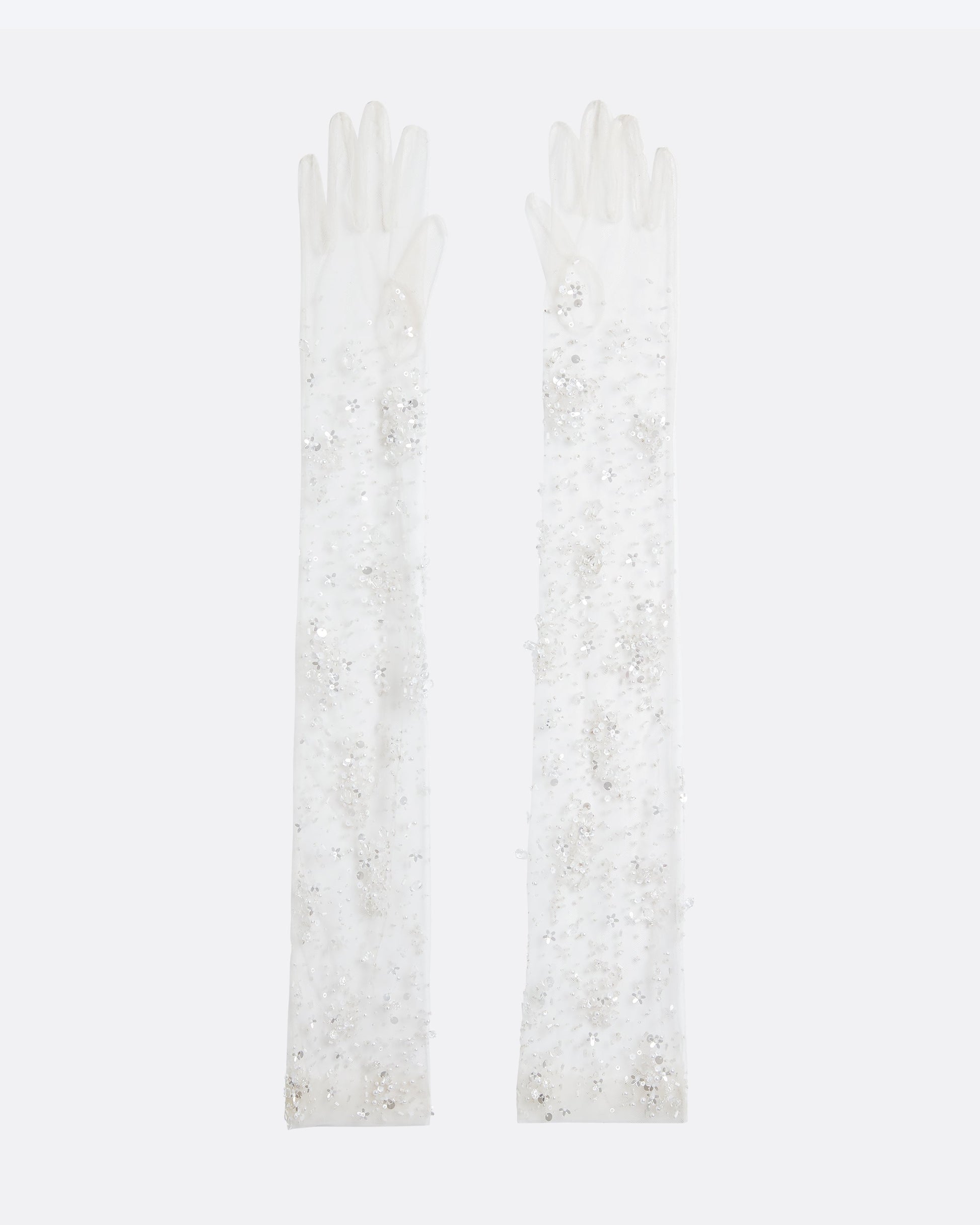 Long line gloves in ivory Tulle with crystal Bouquet embroidery.