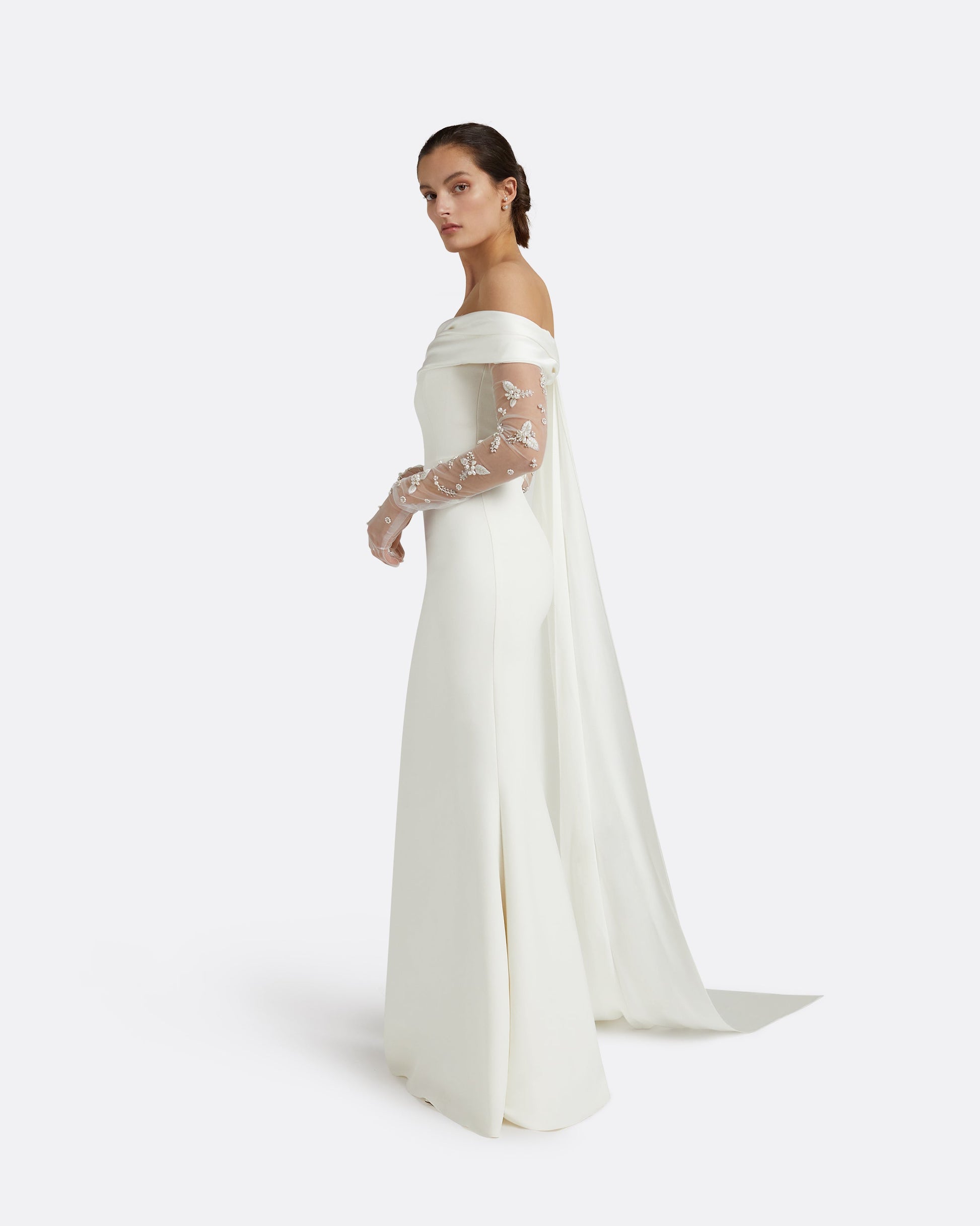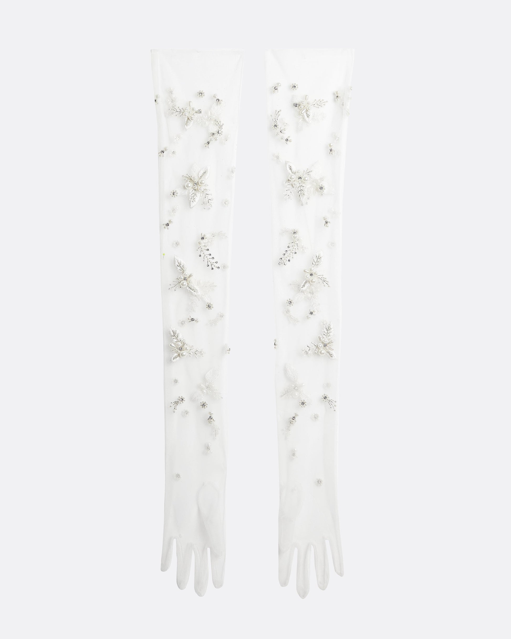 Long line gloves in ivory with Pearl Floral embroidery.