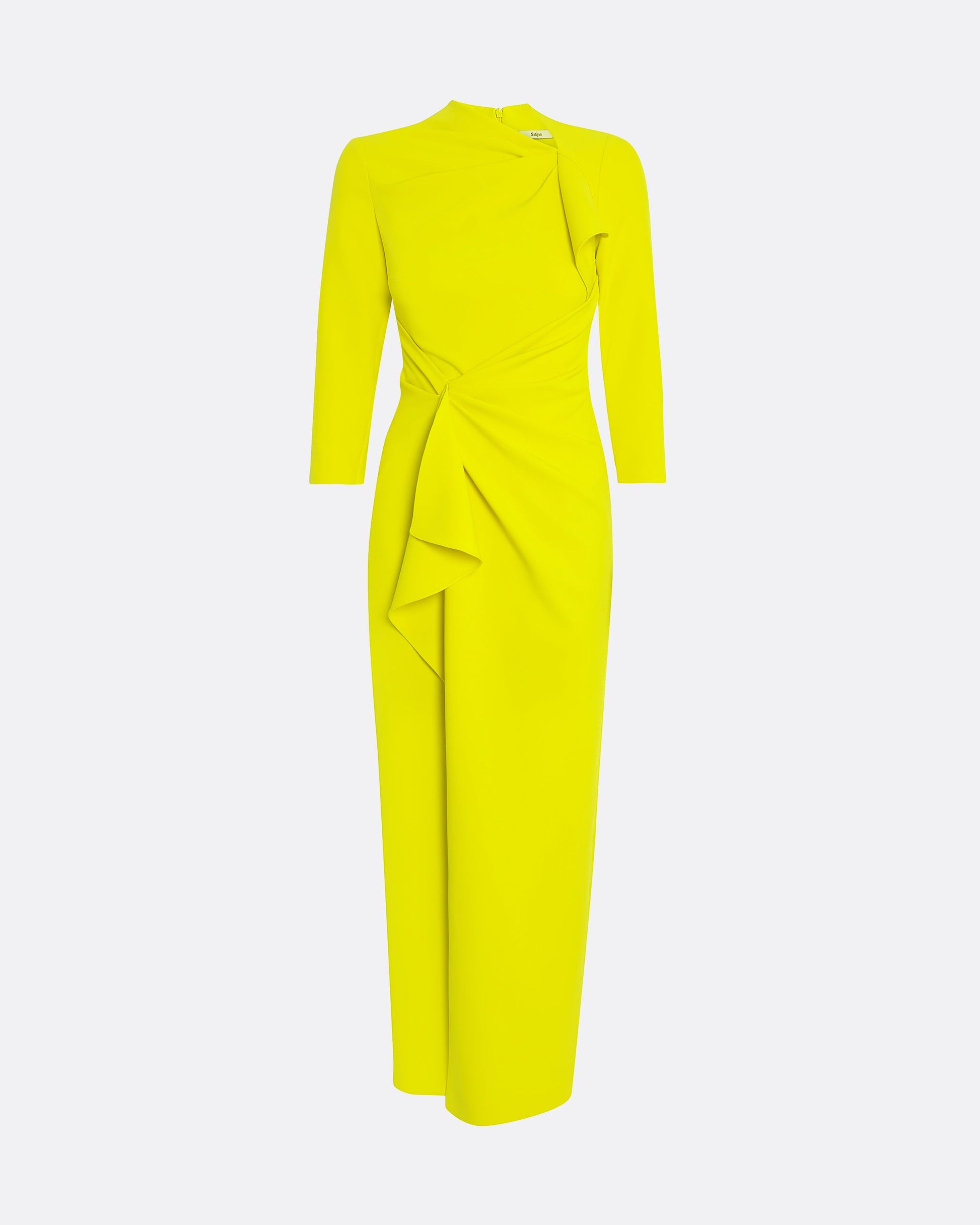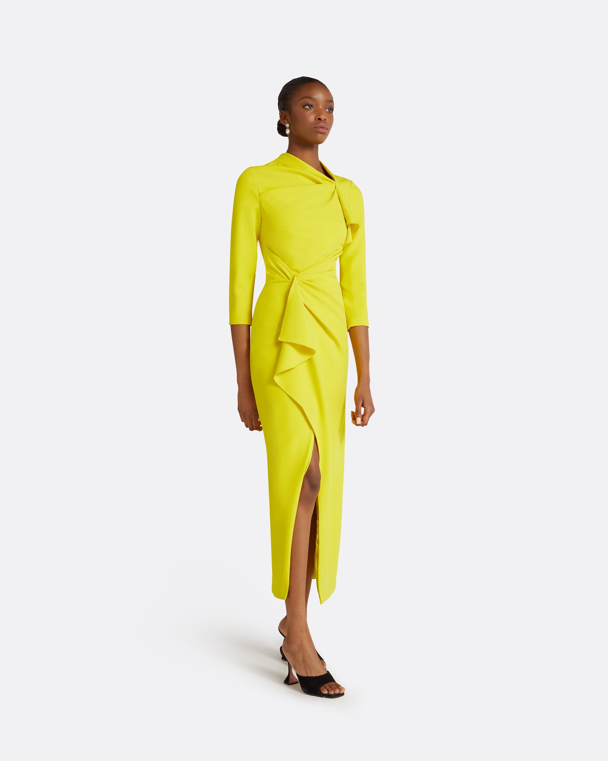 Cocktail dress with gathered drape details in chartreuse Heavy Crepe.