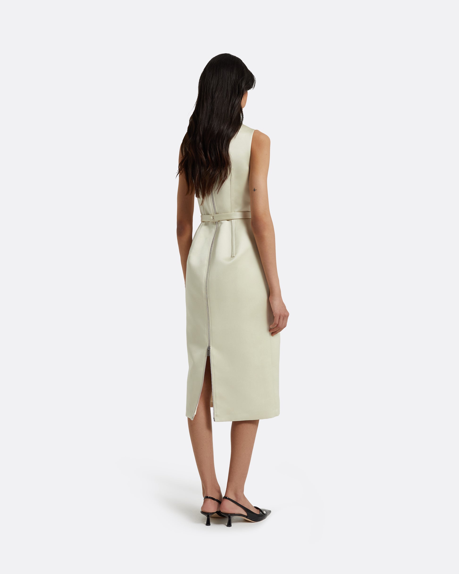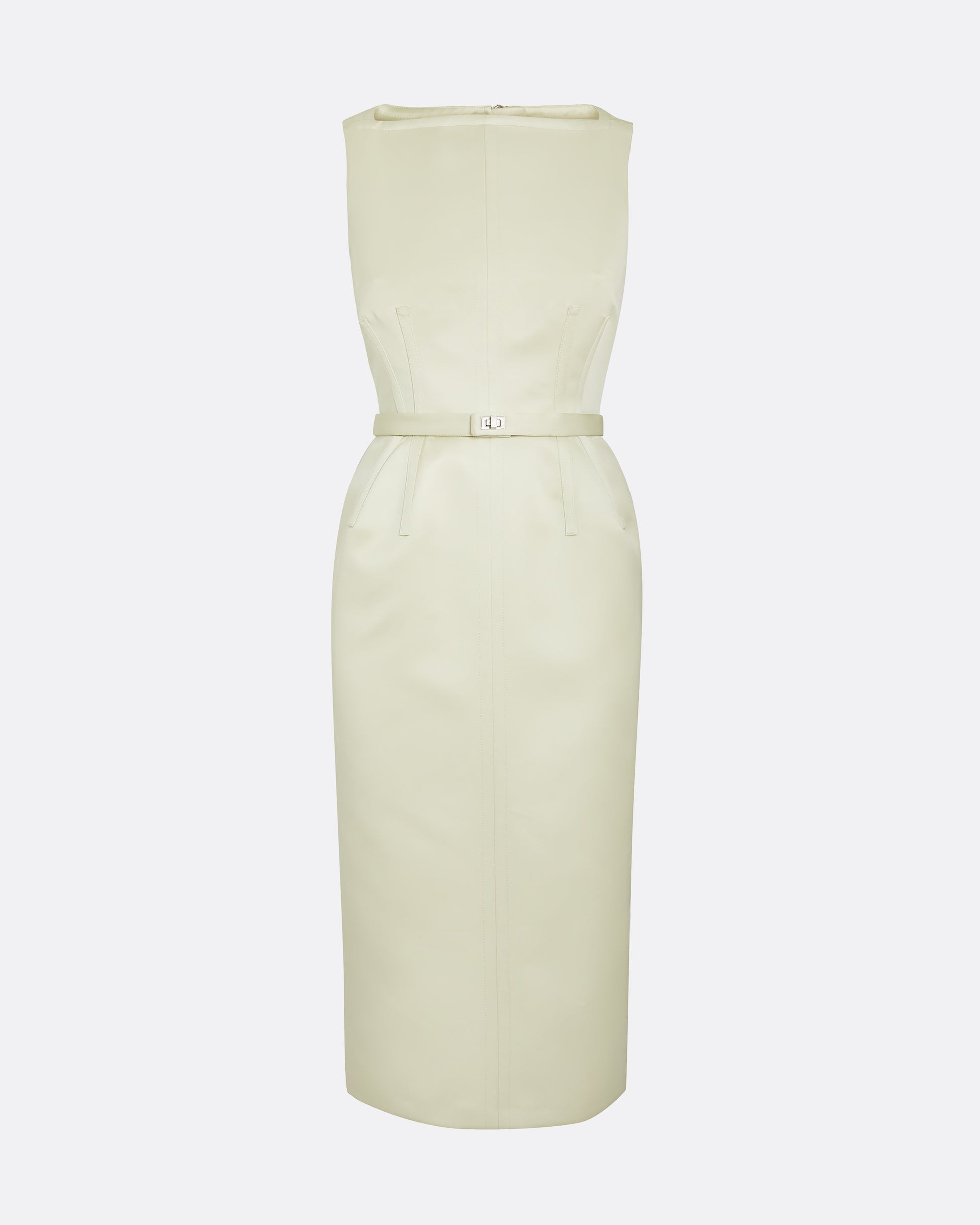 Cocktail dress with high boat neck and corset detail in sorbet Tech Duchess.