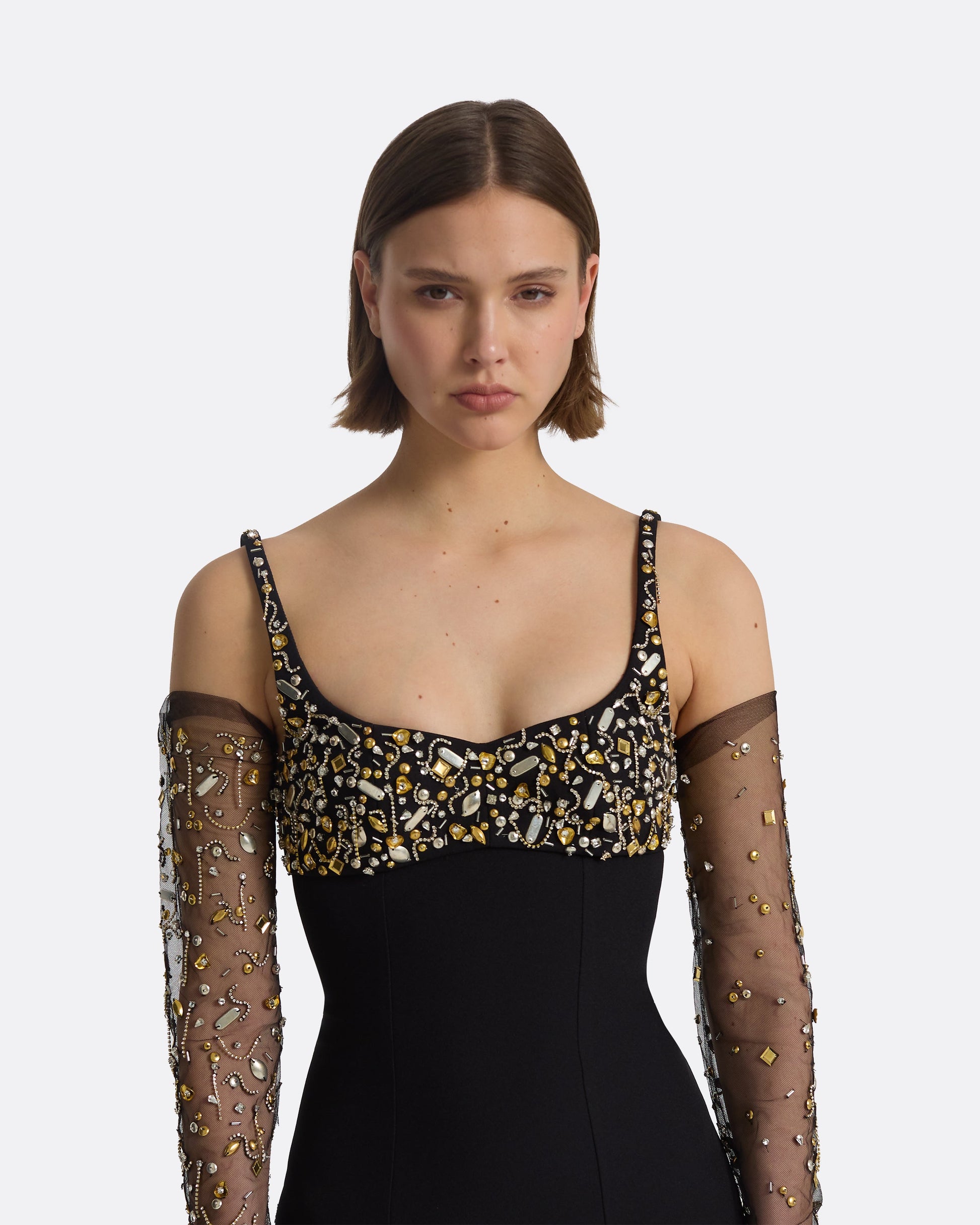 Styled with the Astin gloves in black and Celestial Scatter embroidery.