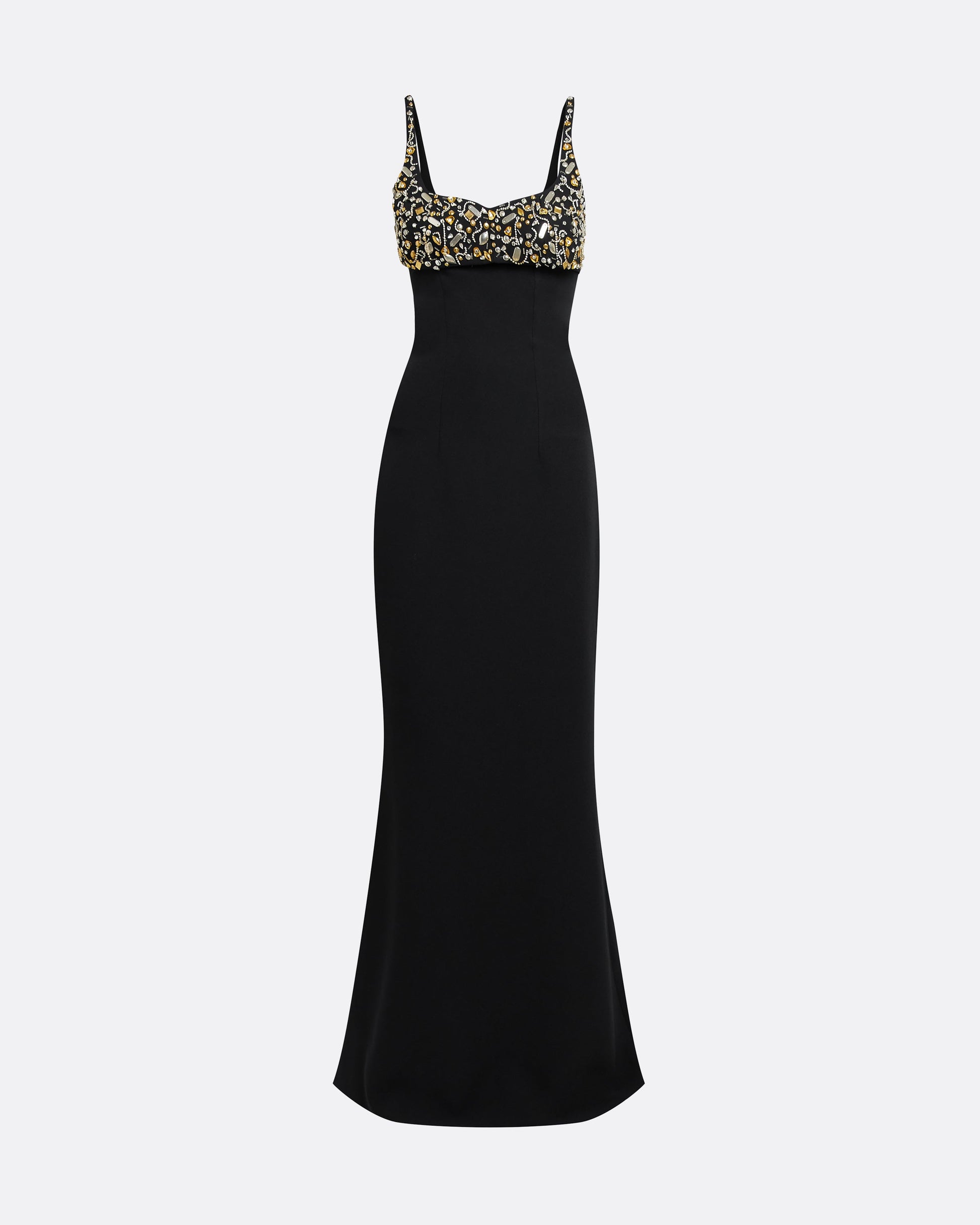 Floor length, fishtail skirt gown with sweetheart neckline in black Heavy Crepe and Celestial Scatter embroidery.
