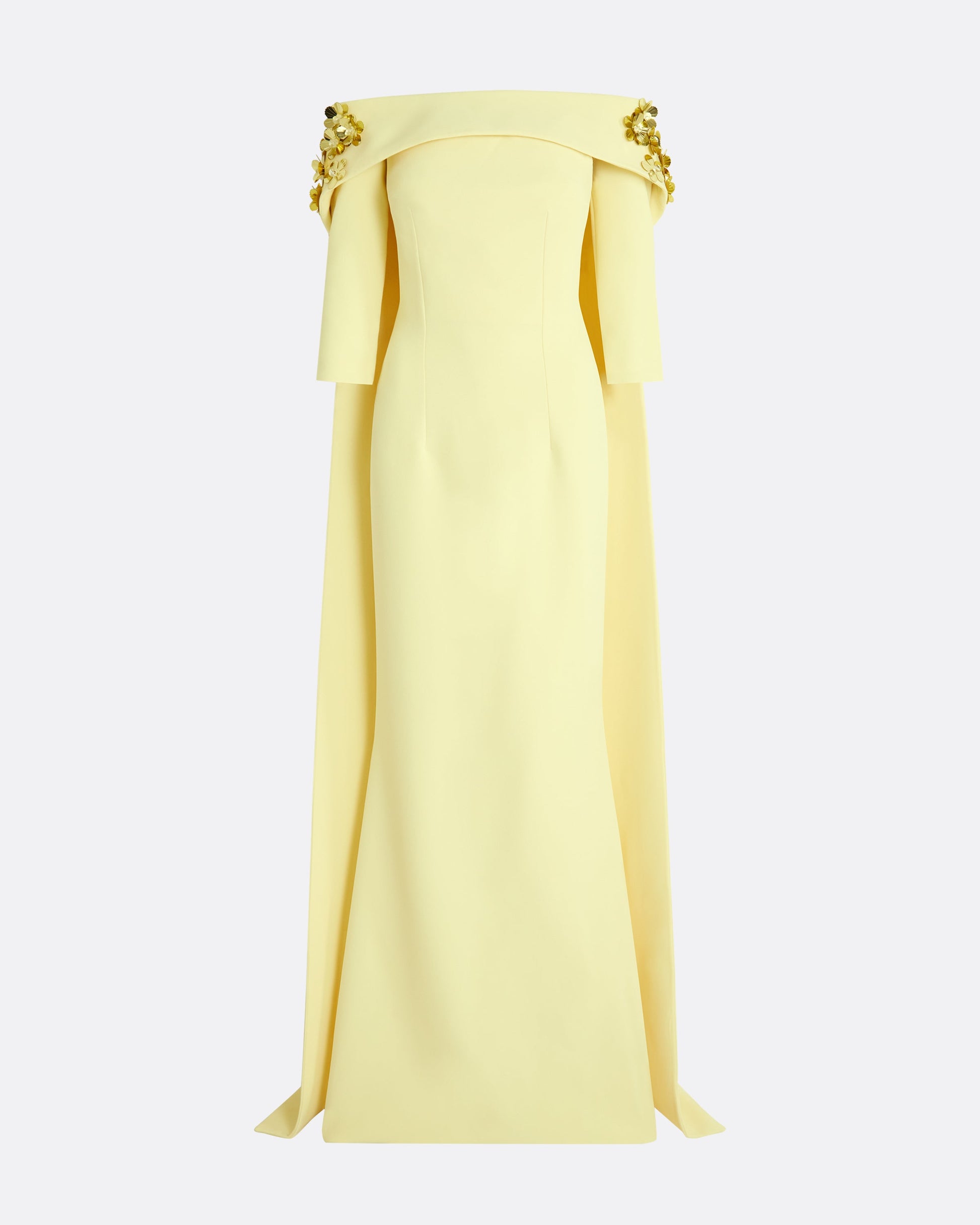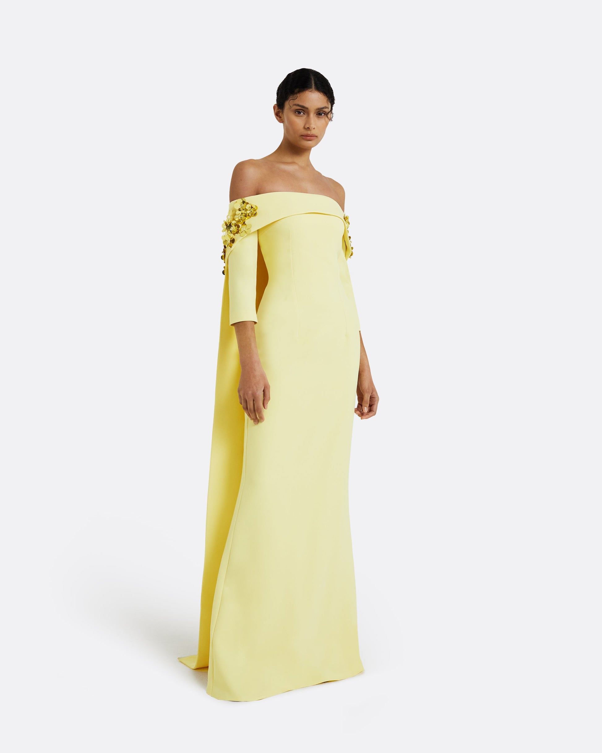 Bustier long dress and off shoulder topper with trail long back and straight sleeve, in pale yellow and yellow flora embroidery.