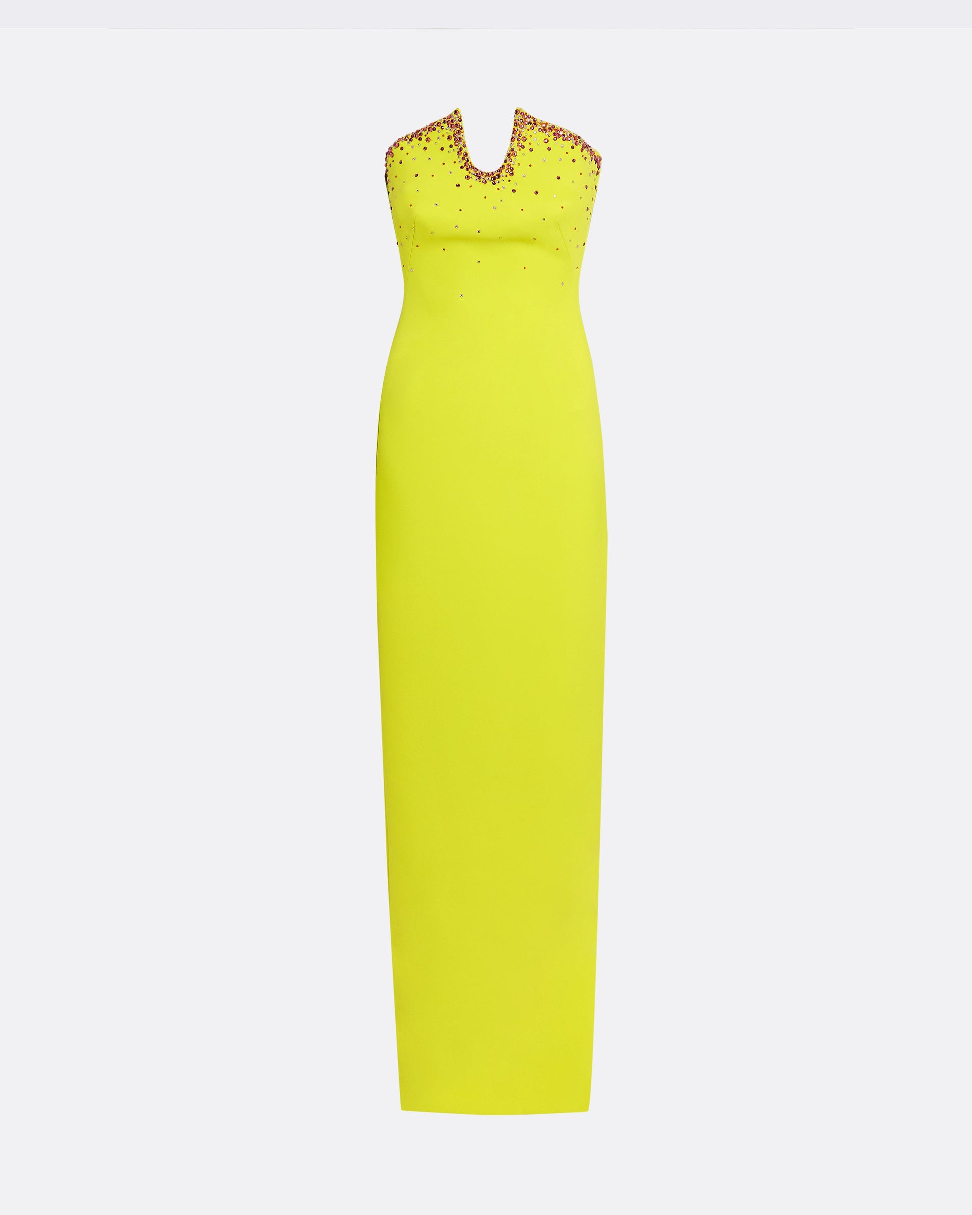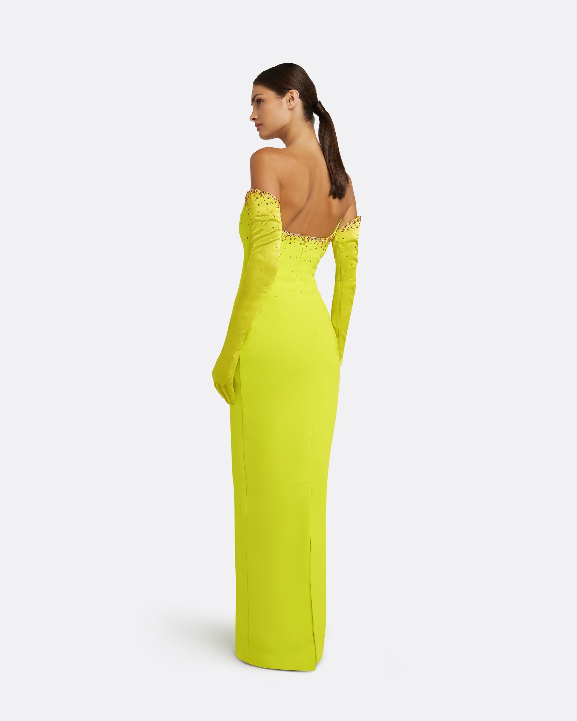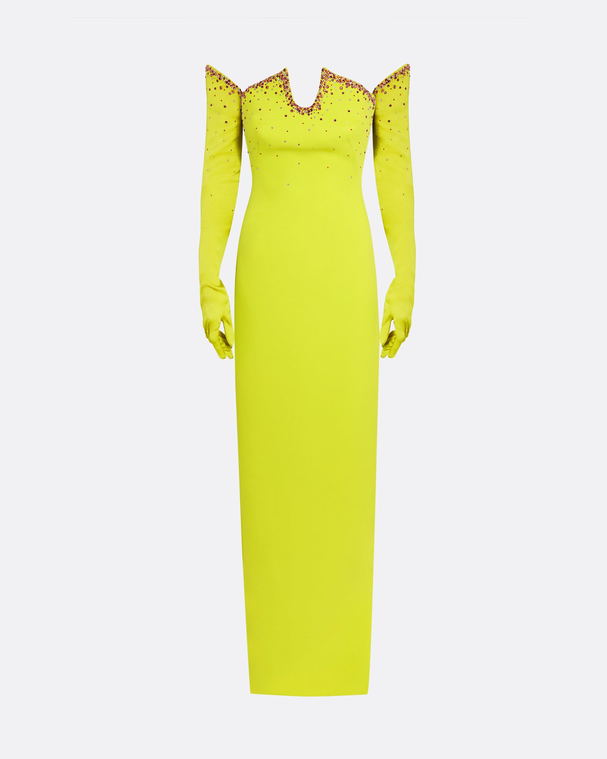 Bustier column gown with sculpted neckline and long line glove with sculpted edge in meknes Heavy Crepe and Satin back Crepe, embroidered with multi-grenada Pop Scatter embroidery.