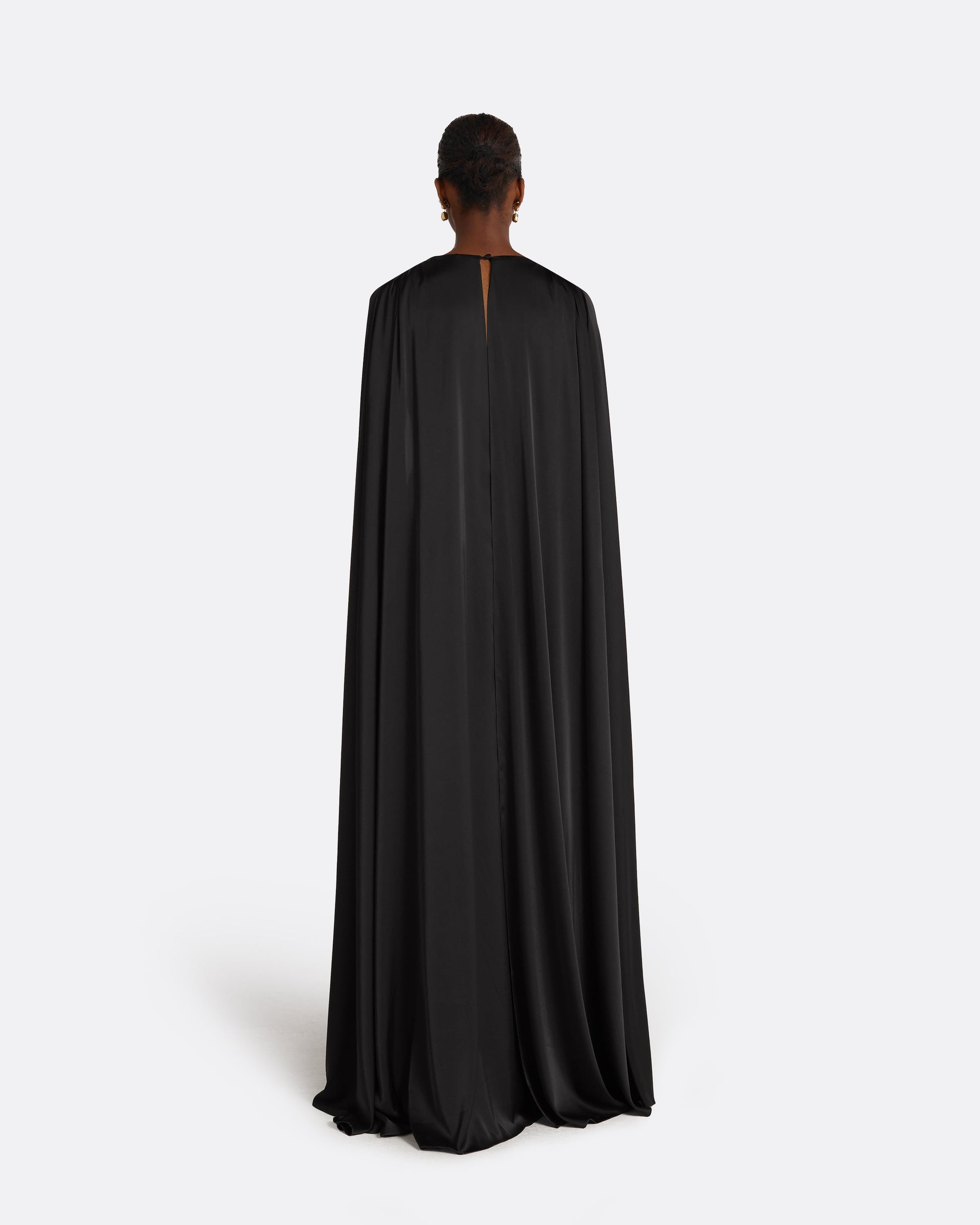 Dramatic backless gown with plunging neckline and cape detail in black Satin Chiffon with multi-darks Reef Trim embroidery.
