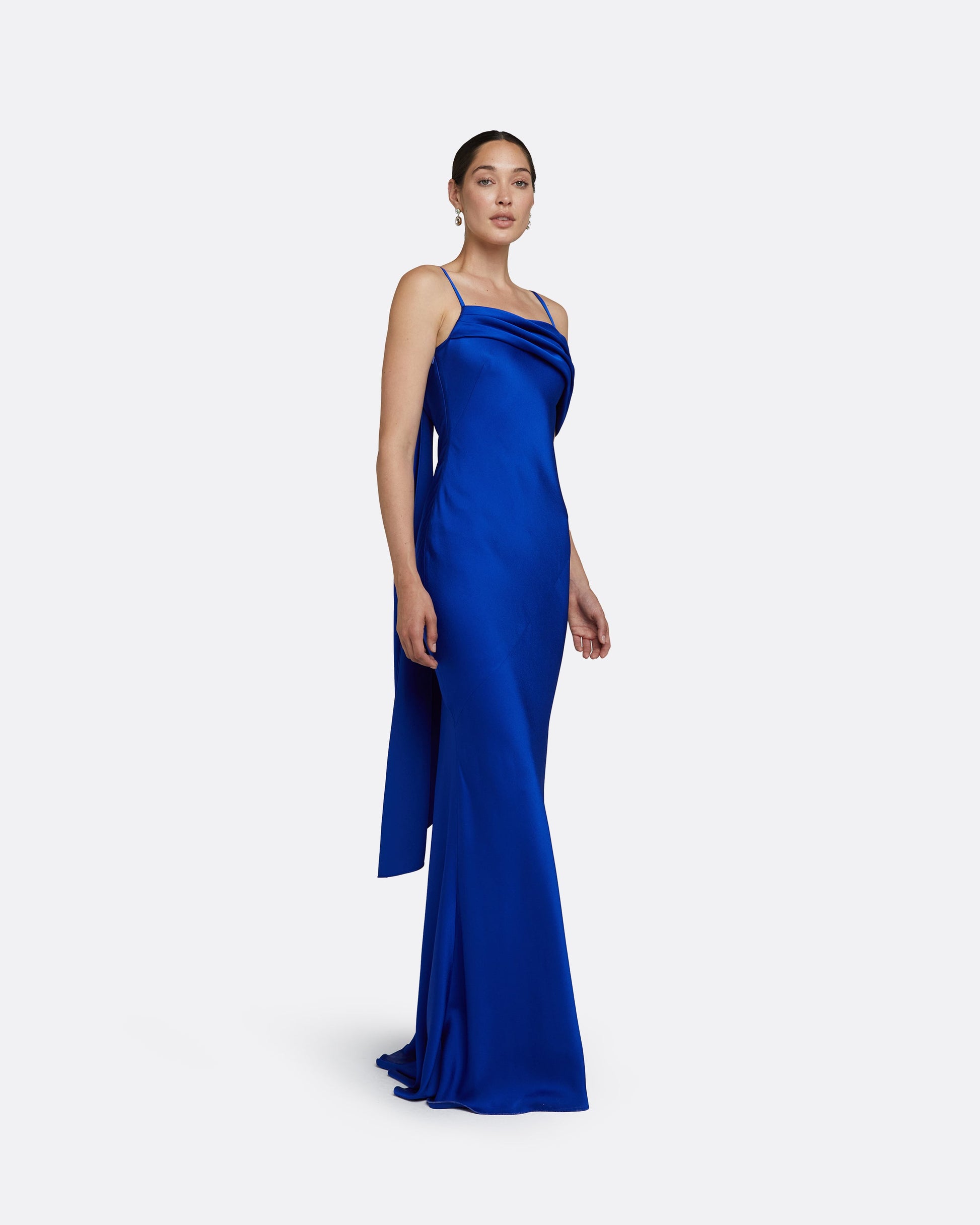 Floor length, caped gown with draped peplum and contrast detail in Marrakech Satin Back Crepe.